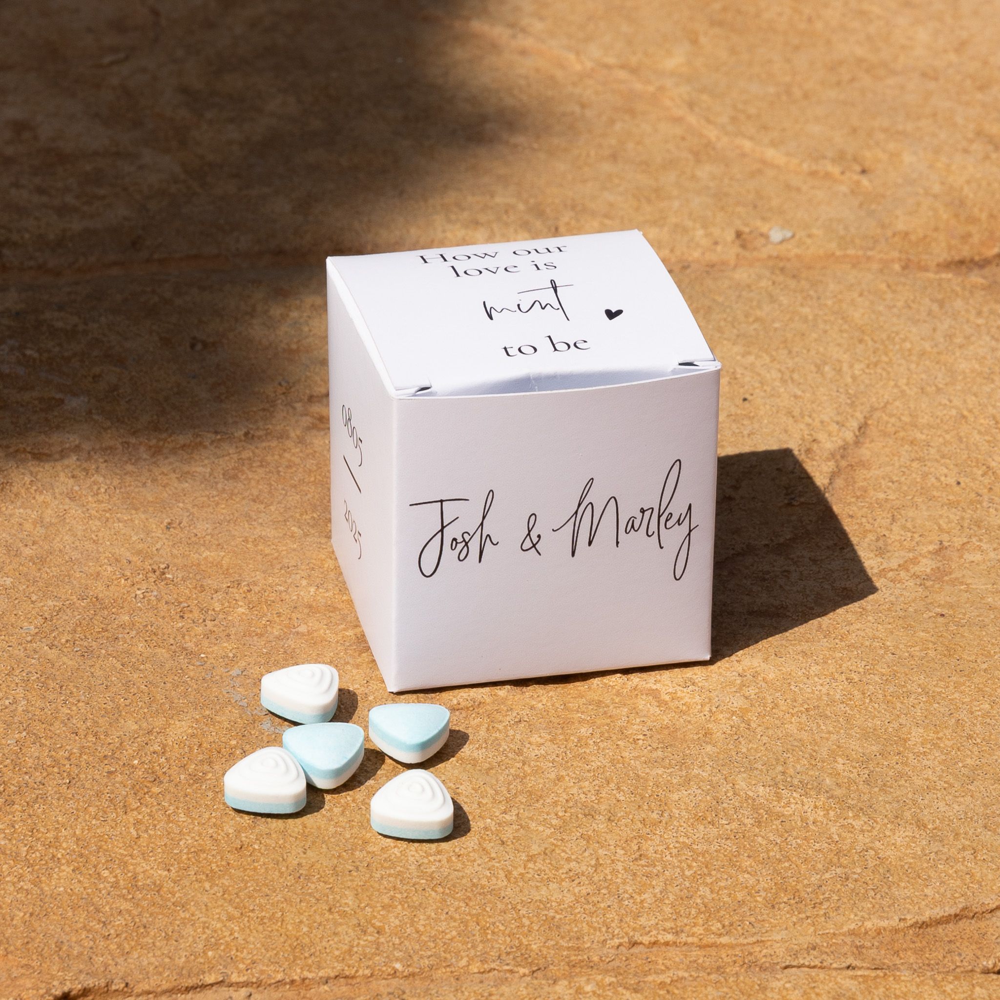 Vul dit kleine doosje van 5 bij 5 cm met smint of pepermunt als bedankje voor je gasten!