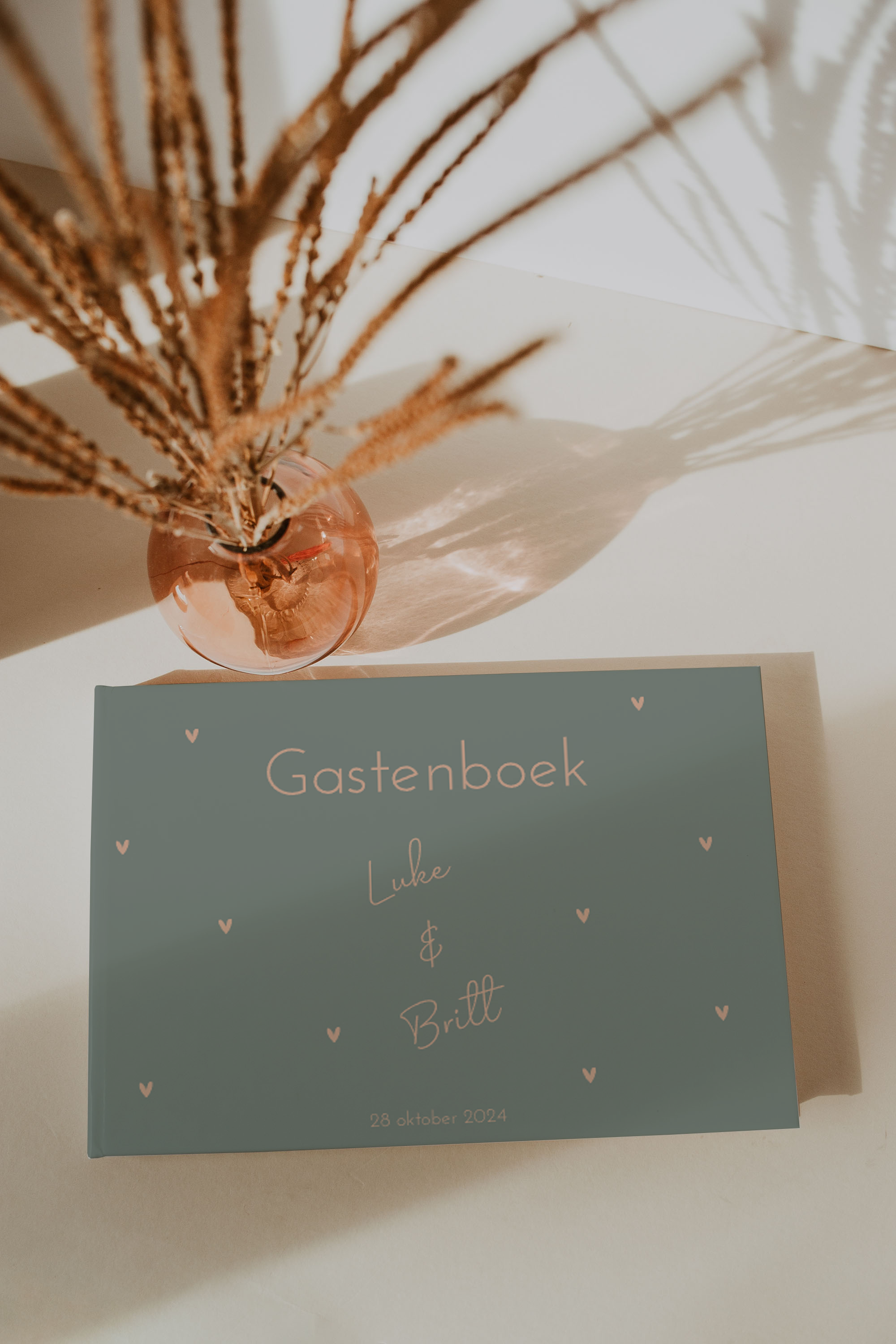 Dit gastenboek past bij de trouwhuisstijl van Luke en Britt, is groen en langwerpig met de afmeting 29,7 bij 21 cm.