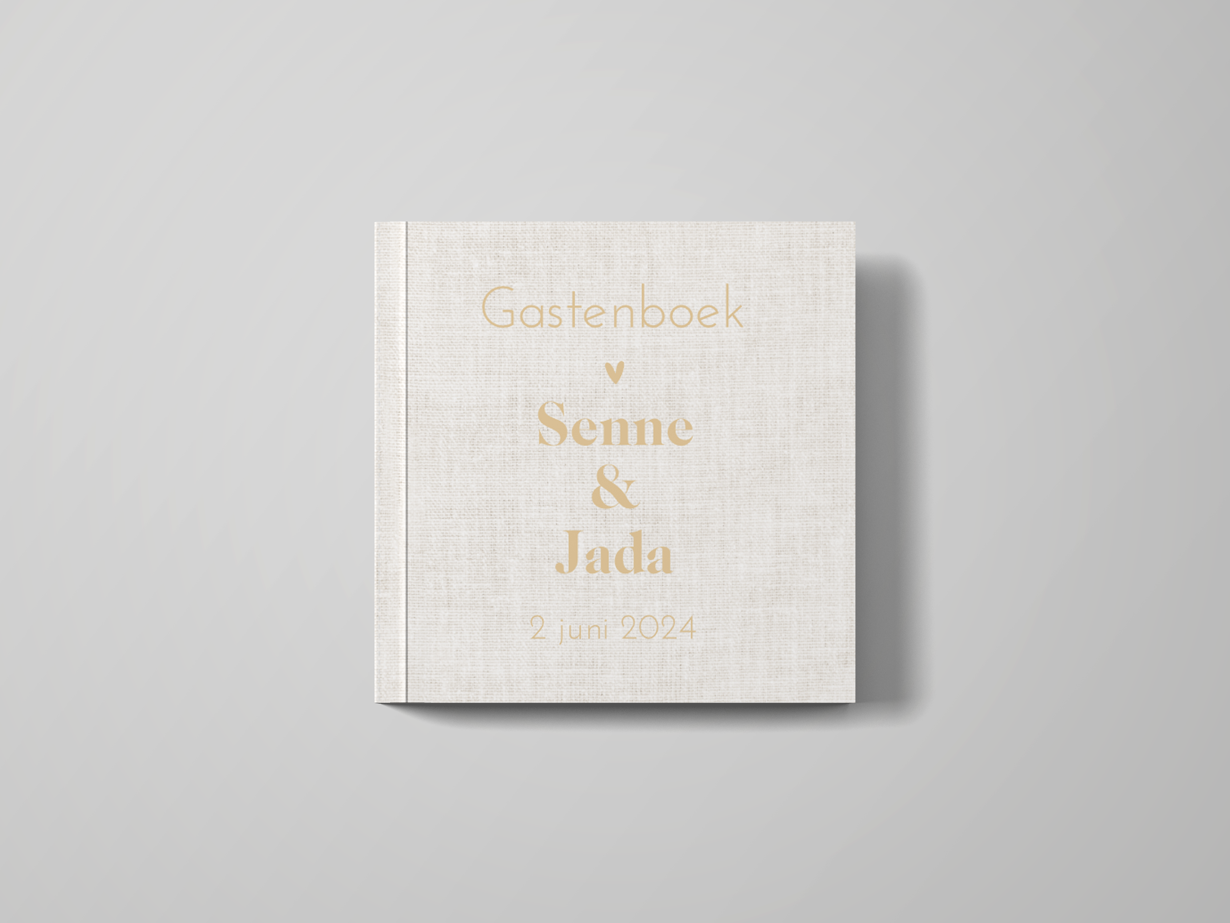 Dit gastenboek past bij de trouwhuisstijl van Senne en Jada en heeft de kenmerkende linnen achtergrond. De boeken kunnen niet met folie worden bedrukt en hebben een gelijkende kleur gekregen.
