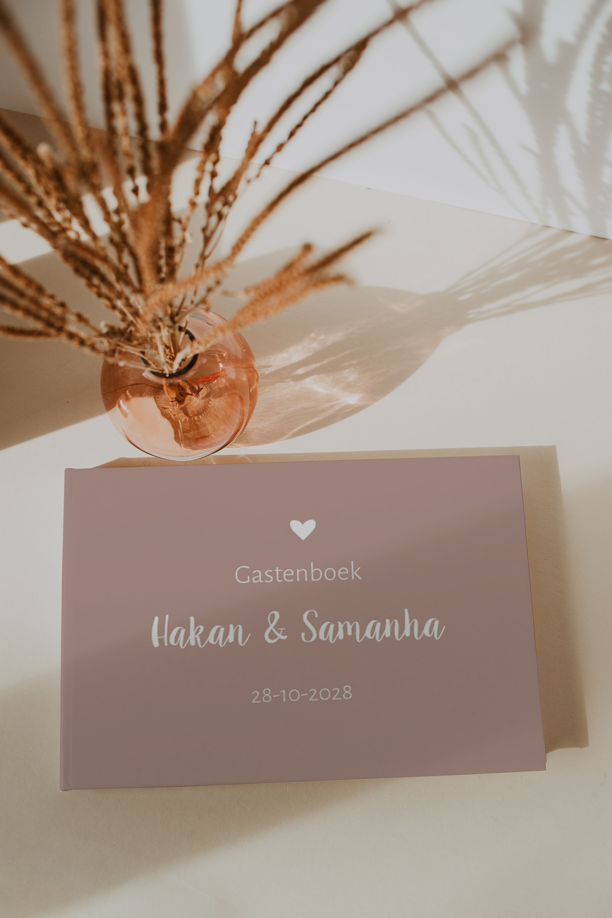 Dit gastenboek past bij de trouwhuisstijl van Hakan en Samantha. De oudroze kleur komt weer terug in de huisstijl. Het is een liggend boek en meet 29.7 bij 21 cm. Stuck on you