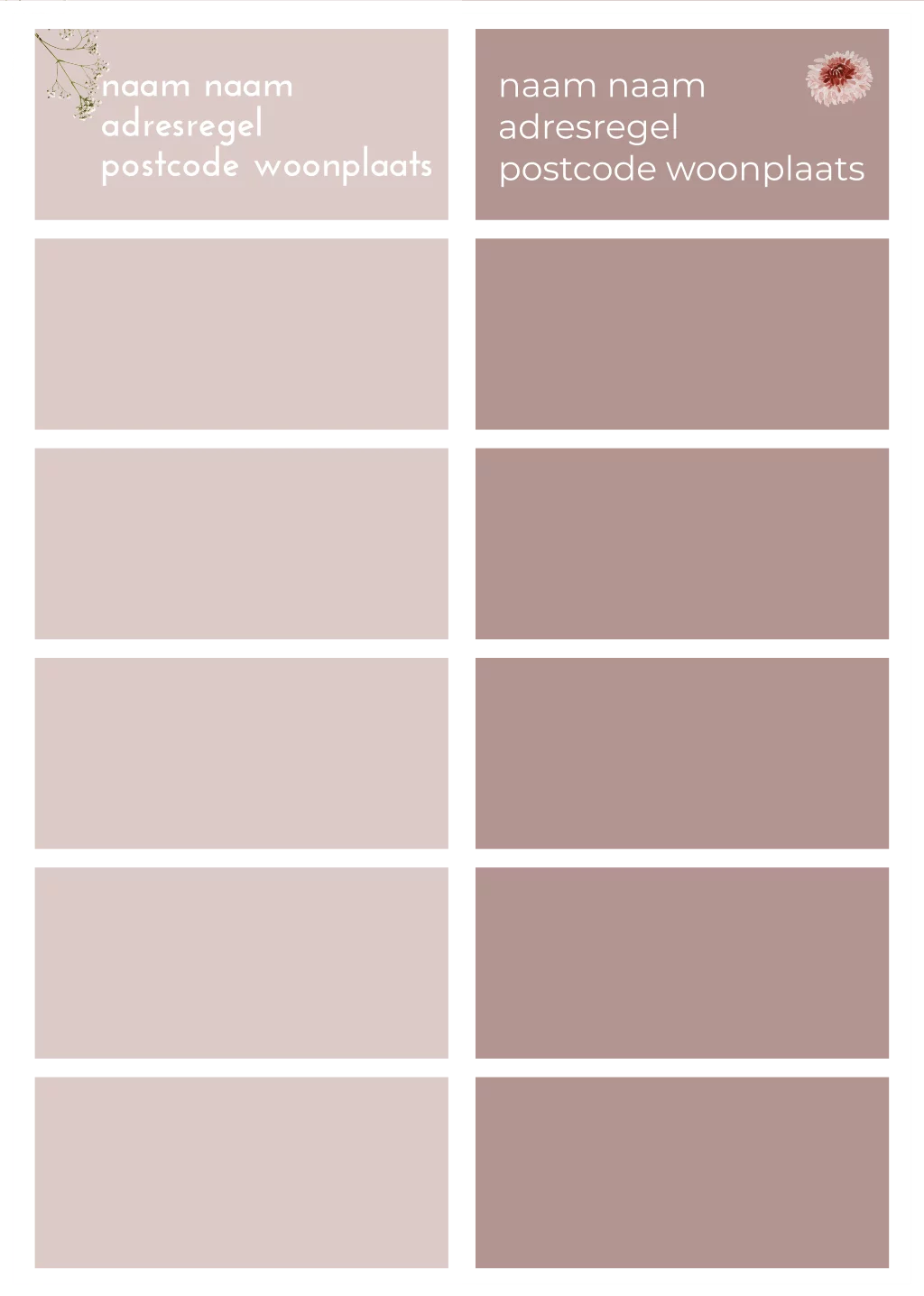 Een adressenlijst uploaden is helaas (nog) niet mogelijk. Je dient op elke sticker een adres te typen, of je maakt een design op en schrijft ze bij aankomst met de hand. Per vel kun je 12 adressen kwijt. Sla deze op met bijvoorbeeld cijfer 1 in je eigen collectie. Vervolgens kun je net zoveel vellen opmaken als nodig zijn. Kopieer je eerste vel, geef vervolgvellen een unieke naam en pas de adressen aan. Maak zoveel als nodig is en plaats ze dan 1 voor 1 in je winkelmandje. Zo bestel je de adres etiketten!
