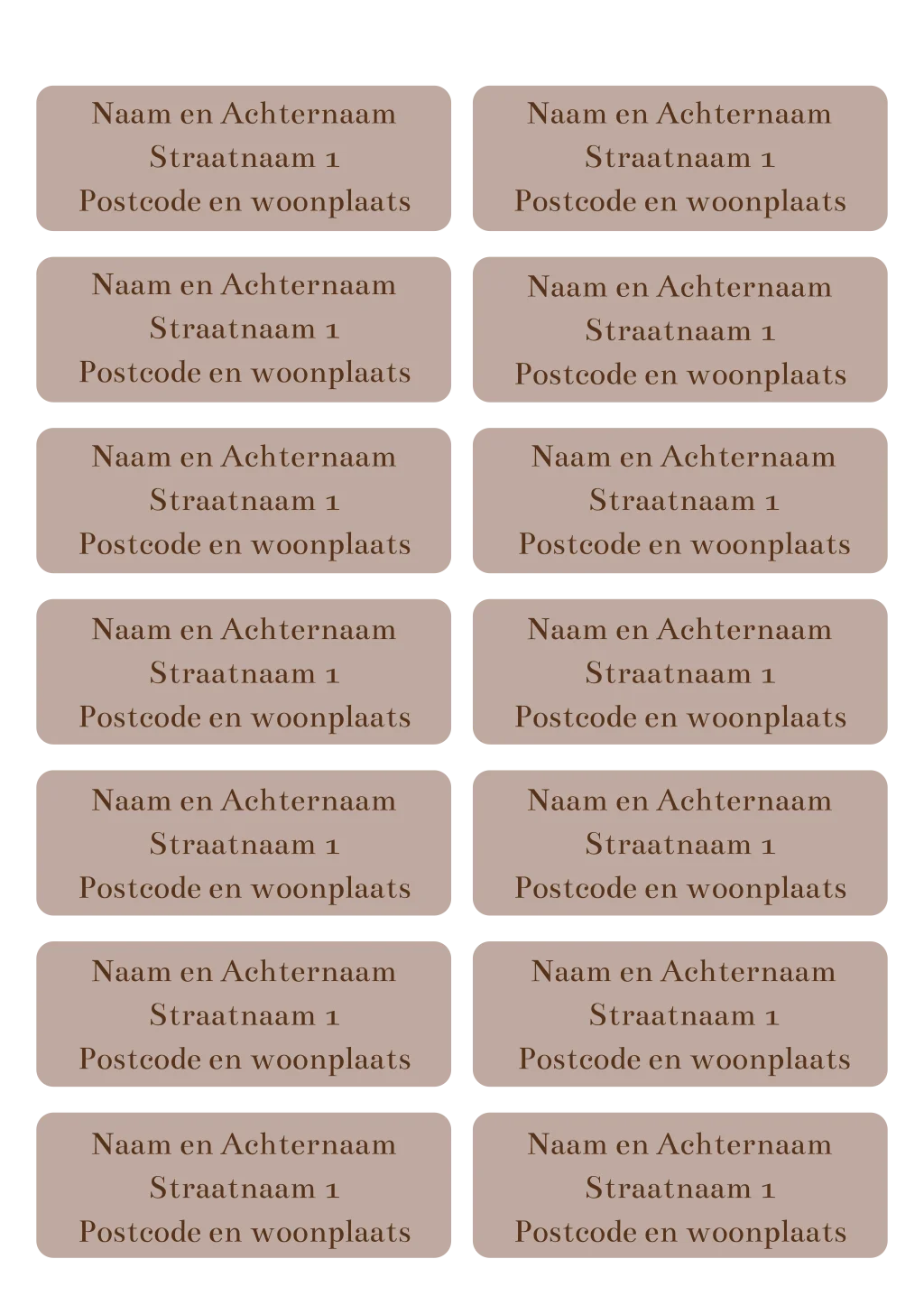 Zelfklevende adresstickers passend bij trouw huisstijl the real deal. Verstuur je uitnodiging in stijl! Deze adresstickers met afgeronde hoeken komen prachtig uit op de biotop enveloppen, die passen bij deze trouw huistijl. Er zitten 14 stickers op 1 vel. Je kunt op de pagina aangeven hoeveel adresstickers je nodig hebt, zodat het design op alle stickers wordt geplaatst. (set1, set 2 bijvoorbeeld) je kunt bestellen zoveel als dat je nodig hebt.