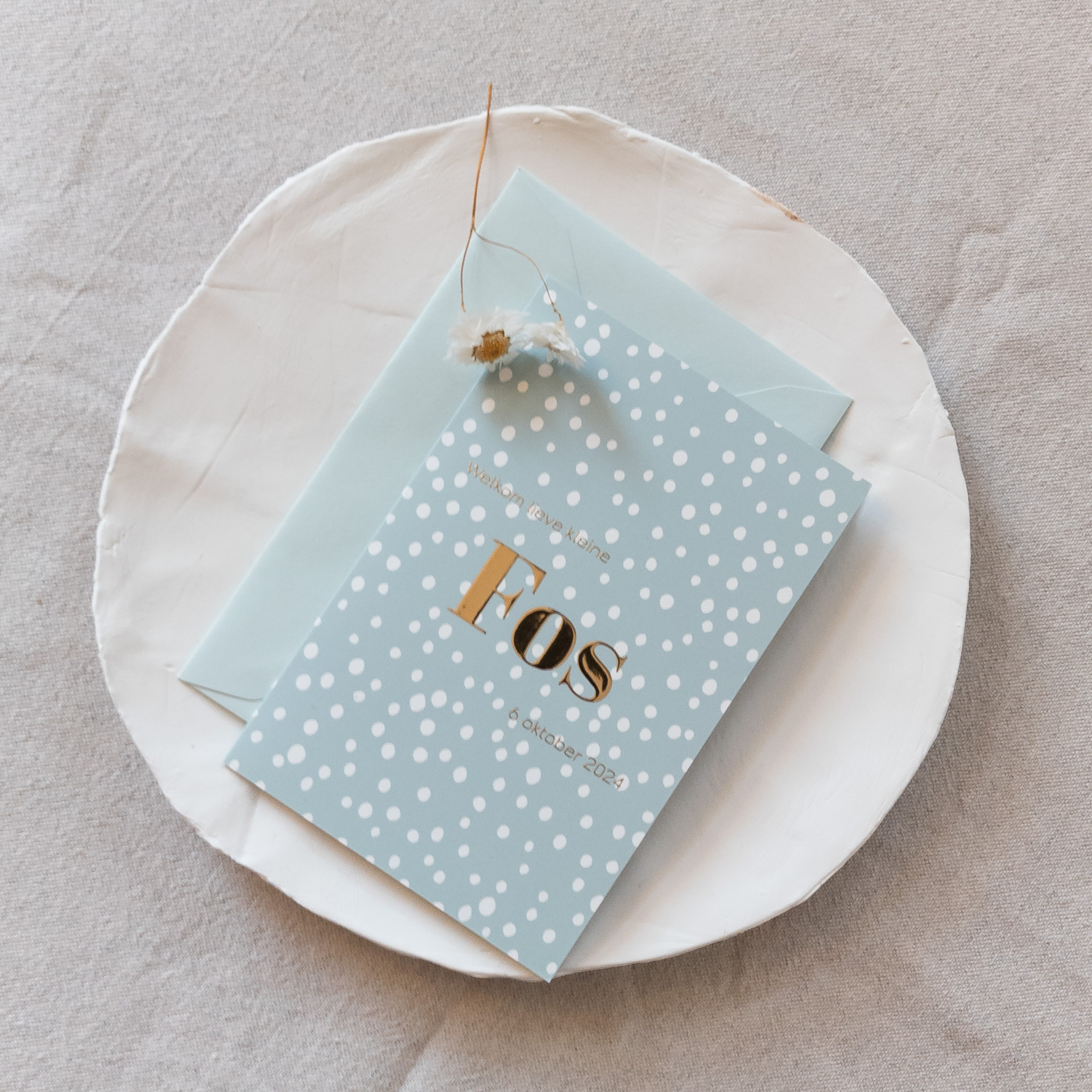 Fris blauwe tint met witte stipjes en goudfolie. Mooi in formaat 11x17 cm! Envelopmaat is dan 12x18 cm. Fos