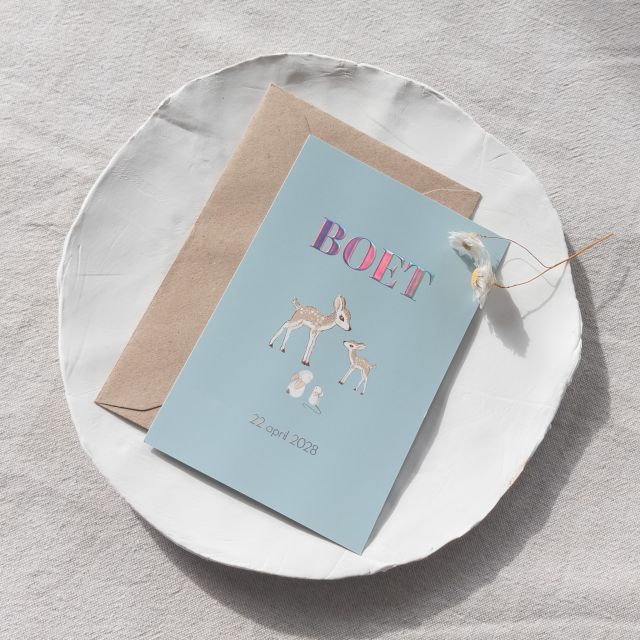 Geboortekaart blauw met hert, konijn en muis
