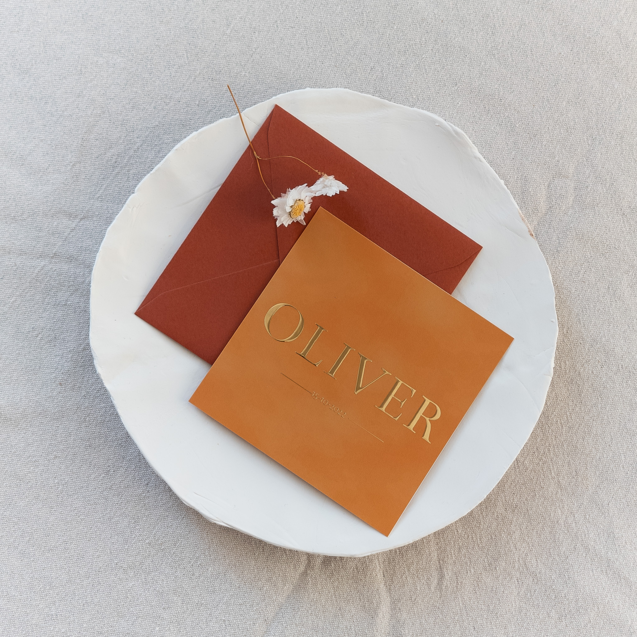 Geboortekaart in okergeel velvet print met goudfolie