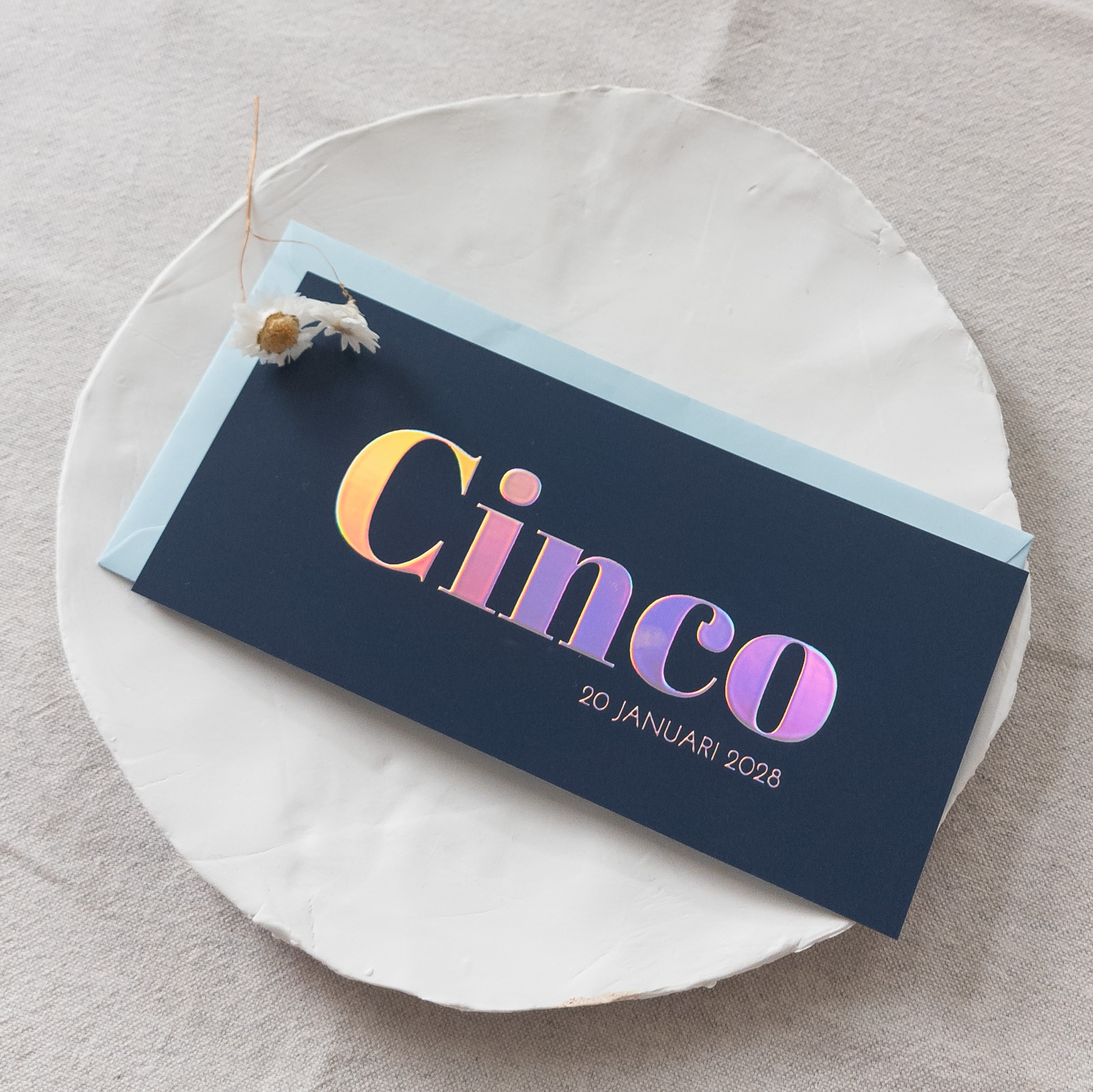 Zo super stoer dit geboortekaartje! Diep donkerblauw gecombineerd met holografisch folie geeft een echt winters sfeertje en de naam knalt van de voorkant af! 21x10 cm met envelopmaat 22x11 cm. Cinco