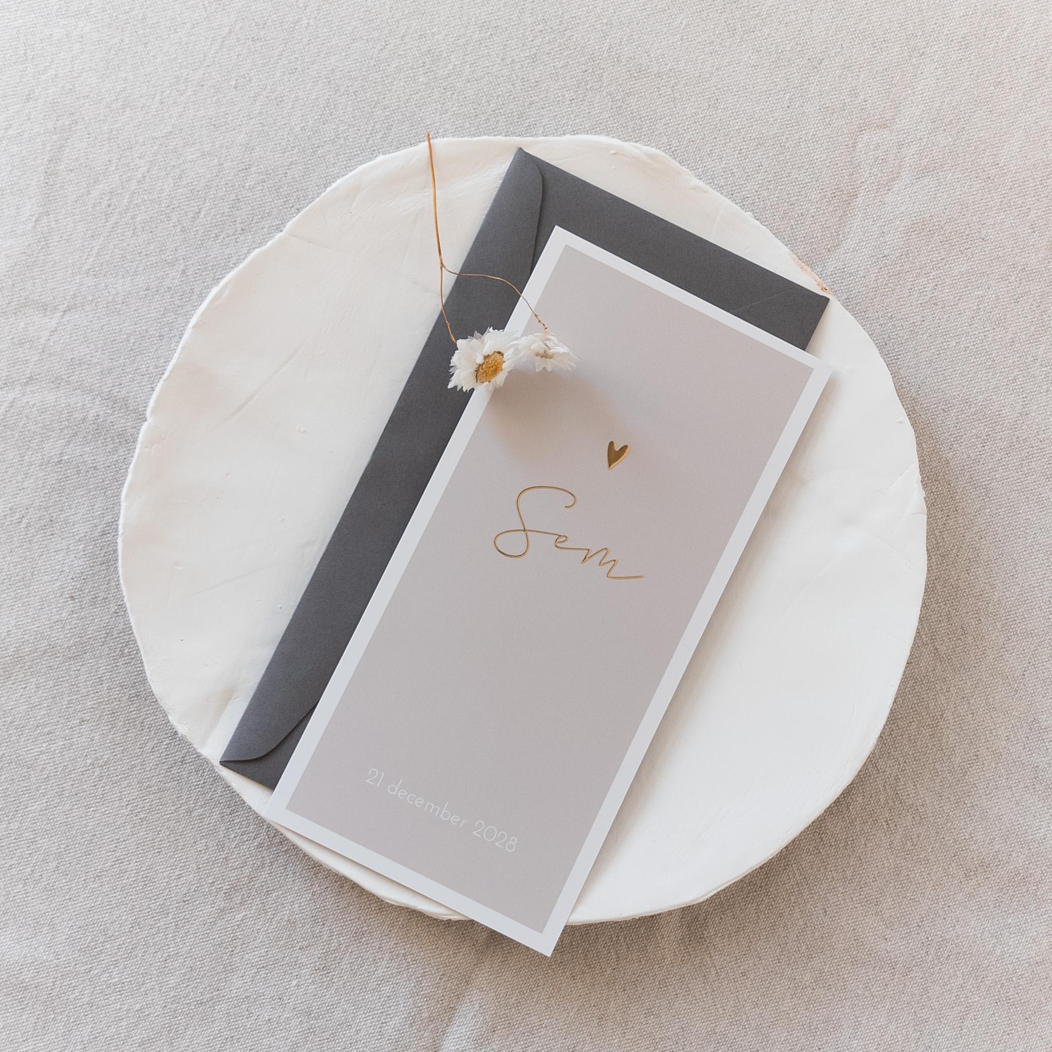 Geboortekaartje grijs beige met goudfolie