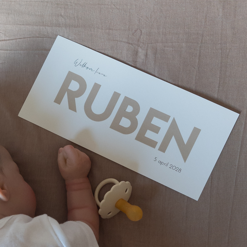 Geef de geboorte van je zoon een stijlvolle en moderne touch met dit minimalistische geboortekaartje in prachtig beige met hoogglans lak. De speelse opdeling van de achterkant geeft niet alleen een unieke uitstraling, maar biedt ook extra ruimte om je persoonlijke tekst toe te voegen. De combinatie van zwart en wit zorgt voor een klassieke uitstraling, terwijl de beige hoogglans lak een vleugje elegantie toevoegt. Dit geboortekaartje straalt rust en eenvoud uit, perfect voor ouders die op zoek zijn naar een clean en modern design. De stoere uitstraling maakt het kaartje geschikt voor zowel jongens als meisjes, waardoor het een unisex karakter heeft.