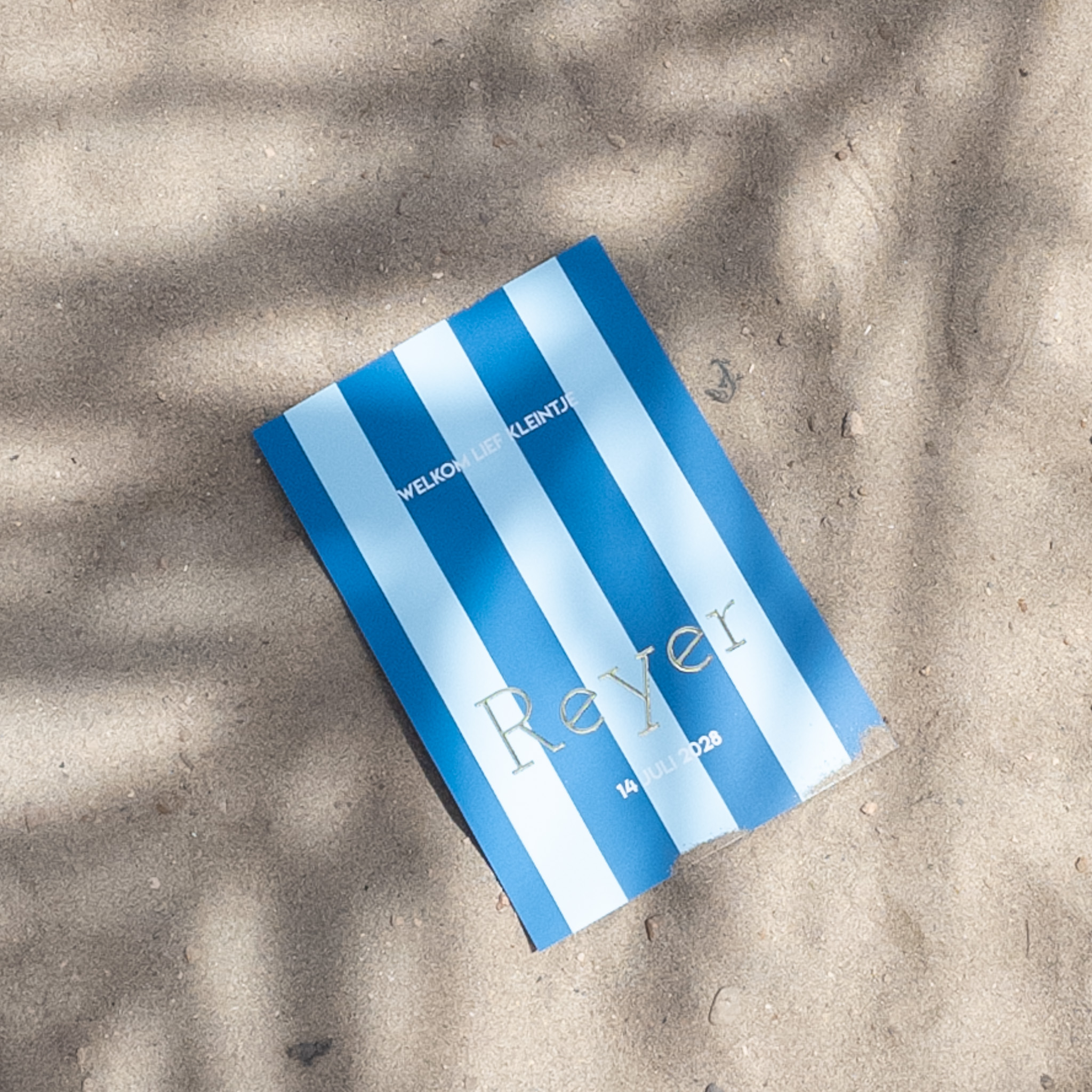 Jongens geboortekaartje in blauw gestreept met de naam in goudfolie en witte accenten. Om de kleuren goed tot zijn recht te laten komen, bestel je dit kaartje het best op mat coated karton. Reyer