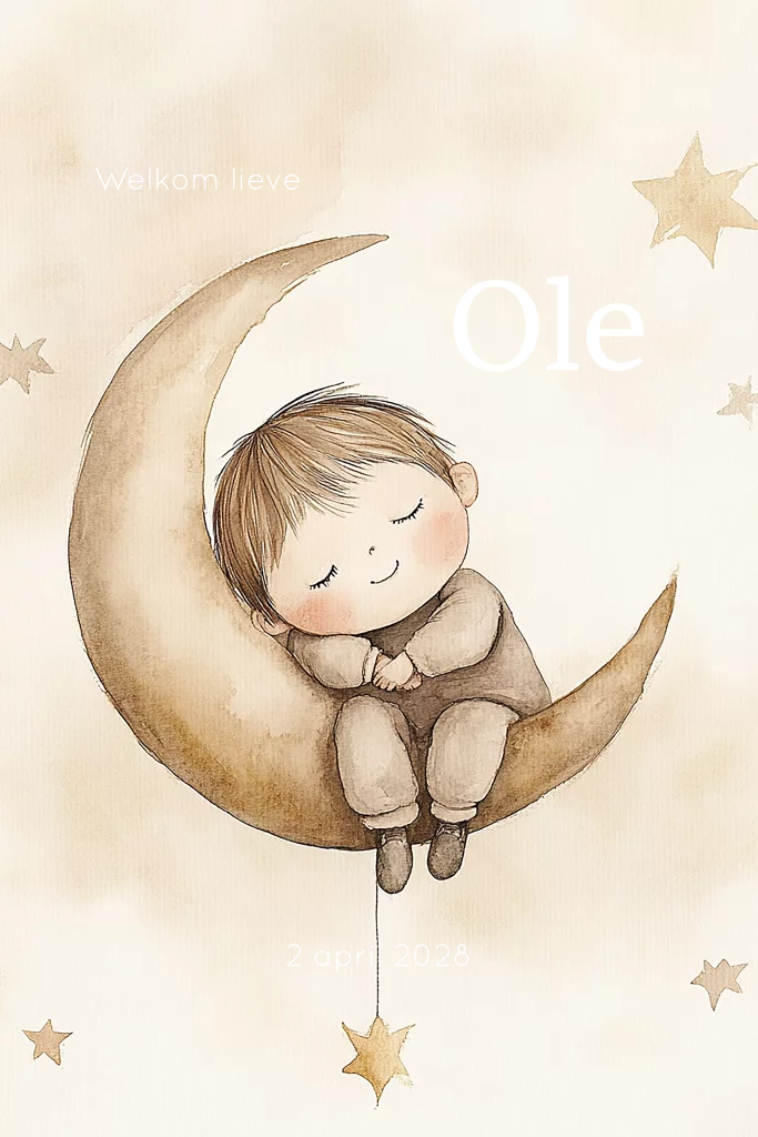 Nostalgisch geboortekaartje voor een jongen. Deze lieve tekening van een jongen op de maan wordt omlijst door goudfolie details. Mooi op linnen papier!