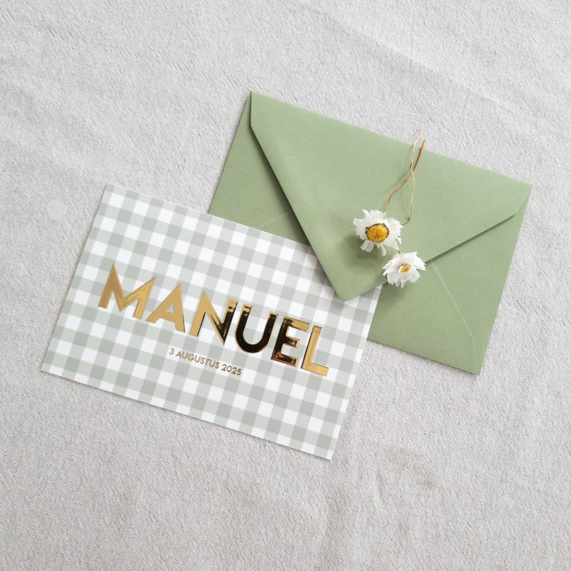 In de hippe kleur sage groen met stoere ruitjes, gecombineerd met goudfolie.