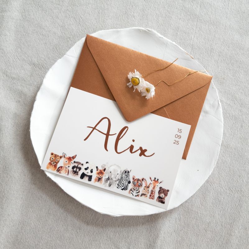 Wilde dieren op het geboortekaartje in mooie watercolor tekeningen. De diertjes komen ook op de achterkant terug! Combineer dit kaartje met stoere UV spotlak om ook de naam eruit te laten springen. Natuurlijk kun je dit ook aanpassen naar goudfolie of een andere kleur folie! Het voorbeeld is gemaakt in formaat 11x17 cm, hierbij horen enveloppen in maat 12x18 cm. Met 1 druk op de knop in de editor kun je ook voor afgeronde hoeken kiezen!