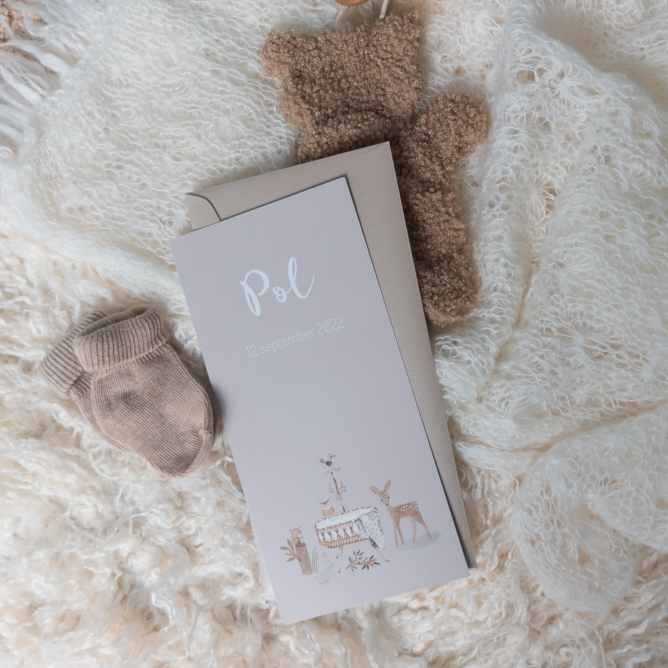 Geboortekaartje met bosdieren in beige naturel tint