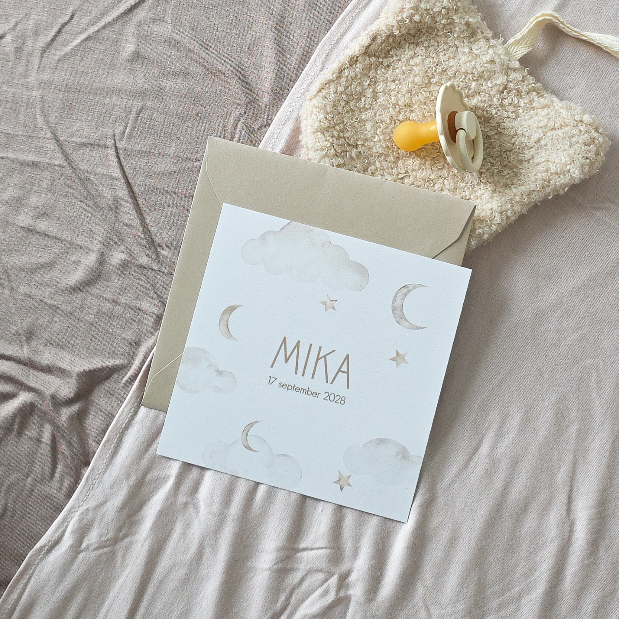 Neutraal geboortekaartje met zachte watercolor afbeeldingen van maantjes, sterren en wolken. De achtergrond heeft een print/look van geschept papier, wat het kaartje wat extra uitstraling mee geeft.