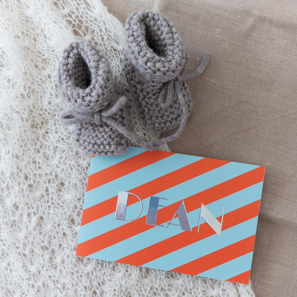 Vrolijk gekleurd gestreept kaartje voor een stoer mannetje! De naam spettert in holografisch folie. Wil je levendige kleuren zoals op het voorbeeld? Bestel dan op mat coated karton en niet op linnen! Linnen papier geeft een lichter, pastelachtig resultaat.