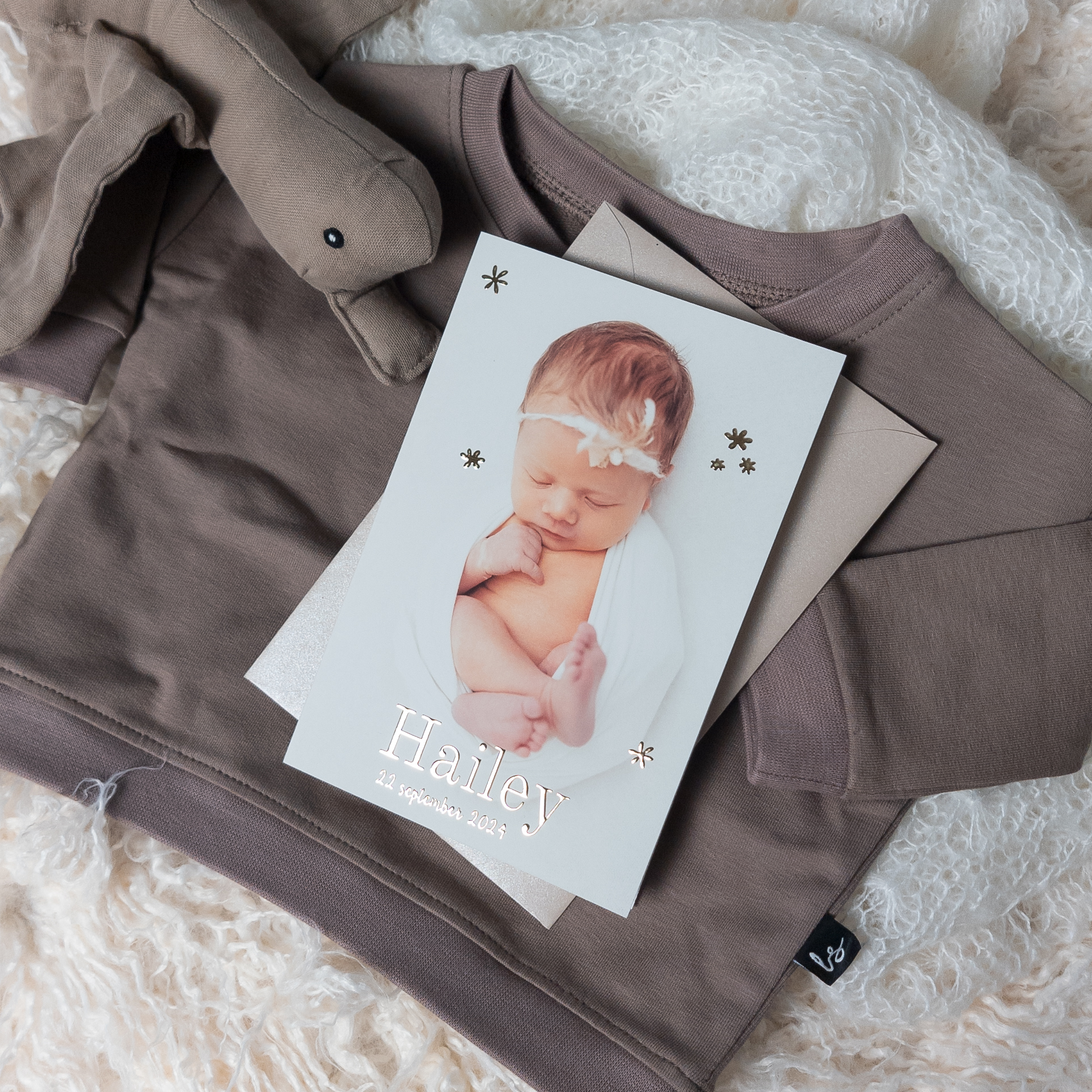 Dubbel geboortekaartje met foto en goudfolie