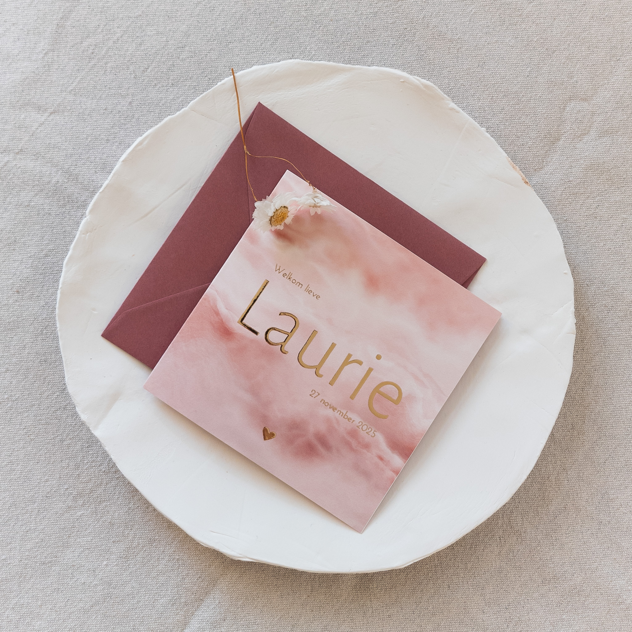 geboortekaart met roze watercolor en goudfolie en lief hartje