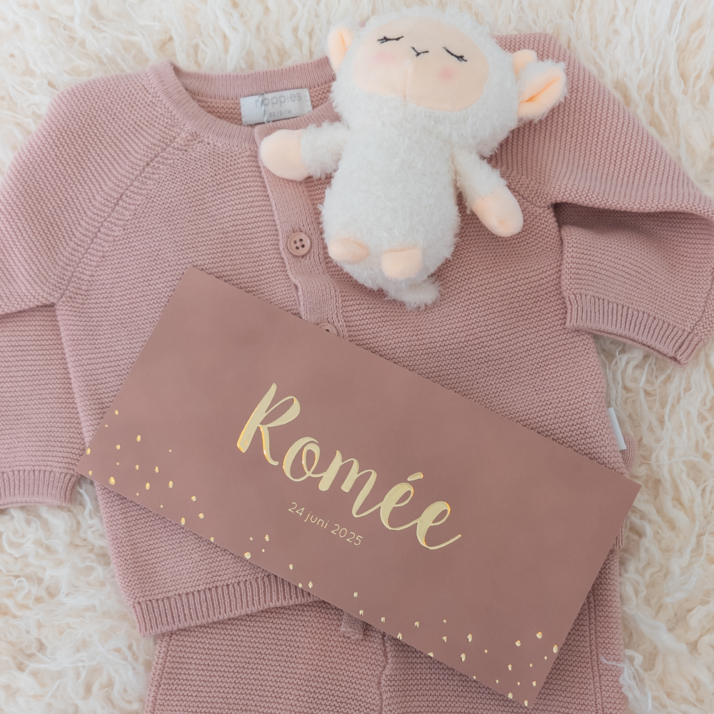 Geboortekaart in velvet print in oudroze met goudfolie spetters