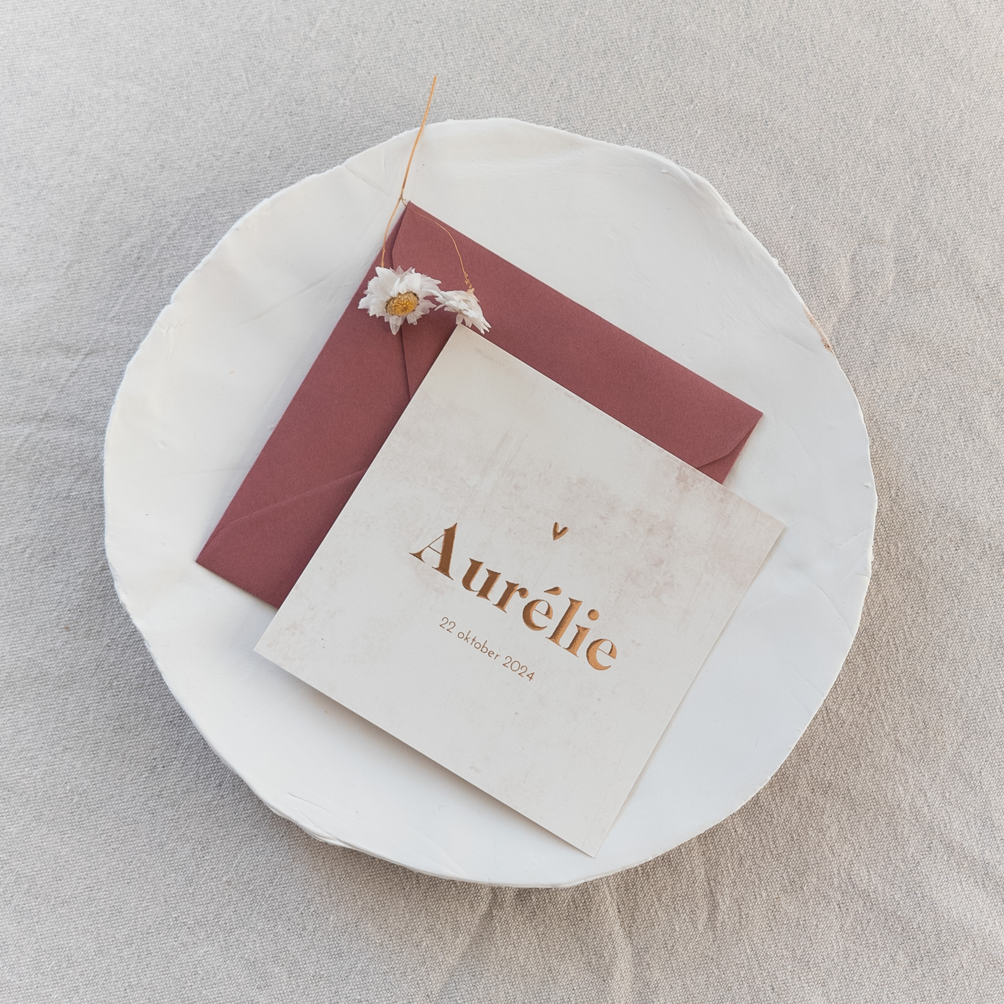 Dit geboortekaartje kun je in een pocketfold gebruiken. Combineer hem met deel 1 van kaartje Aurélie! Vergeet dan niet om de achterkant van dit kaartje leeg te maken. Anders heb je de gegevens 2x en de achterkant zie je in de pocketfold na bevestiging niet. Je bestelt in het geval van de combi voor de pocketfold: dit kaartje, het kaartje met de foto voorkant, en de pocketfold zelf. Bij combinatie van deze 3 losse items, kun je niet voor direct verzenden kiezen! Je dient de onderdelen zelf bij elkaar te combineren en te verzenden in een grote envelop.