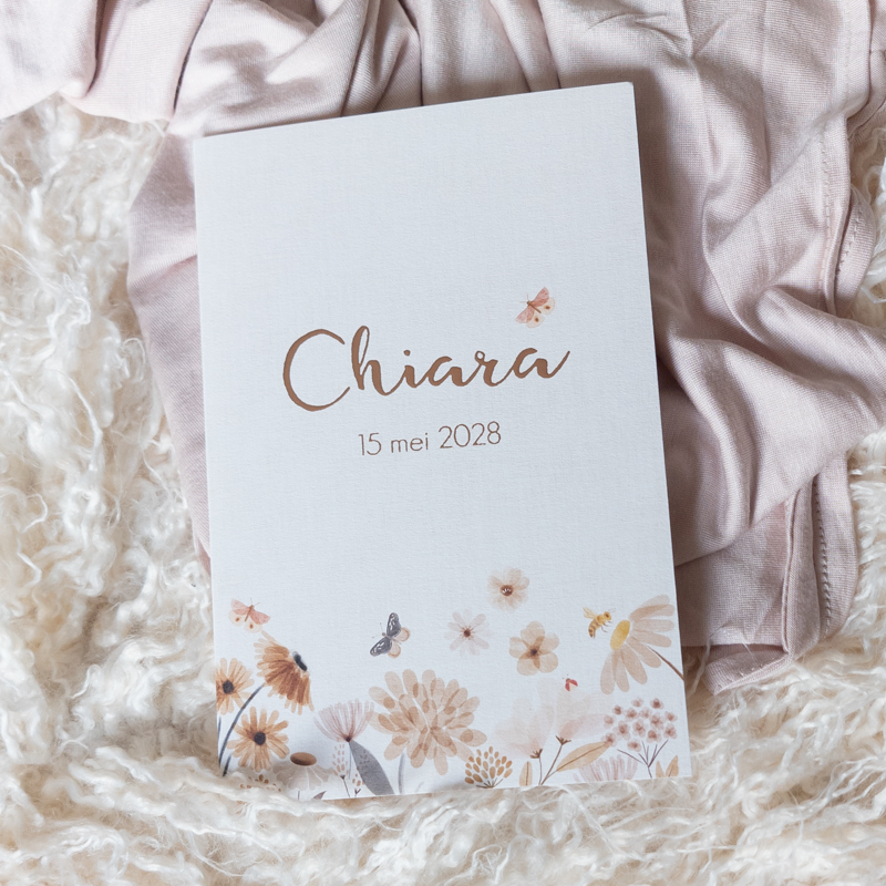 Lief geboortekaartje met linnen look achtergrond en prachtige bloemenprint. Combineert erg mooi met de zachte kleur van roséfolie. Chiara