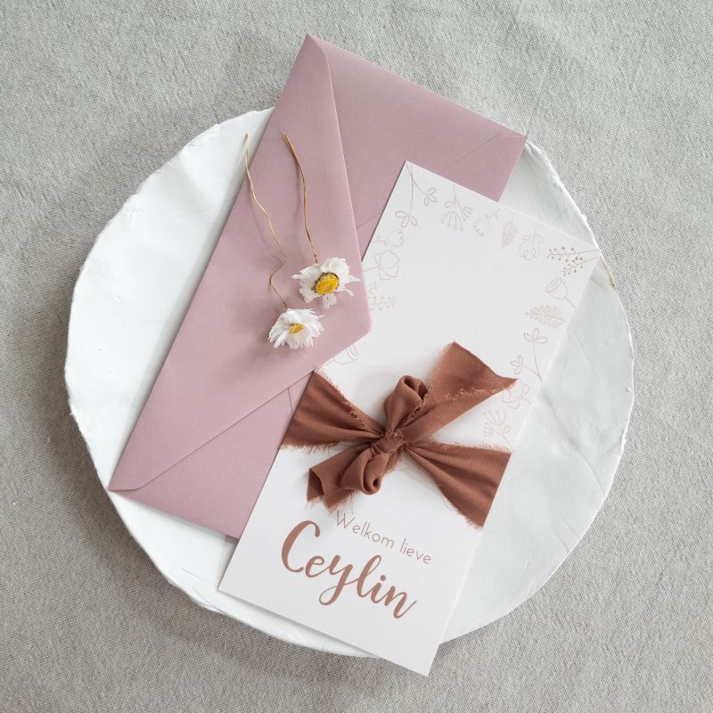 LET OP: Het bruine lint is NIET meer beschikbaar. Pas de kleuren aan naar bijpassend lint van je keuze, of neem contact op over mogelijkheden van ander lint wat ik bij een groothandel voor je kan bestellen!
