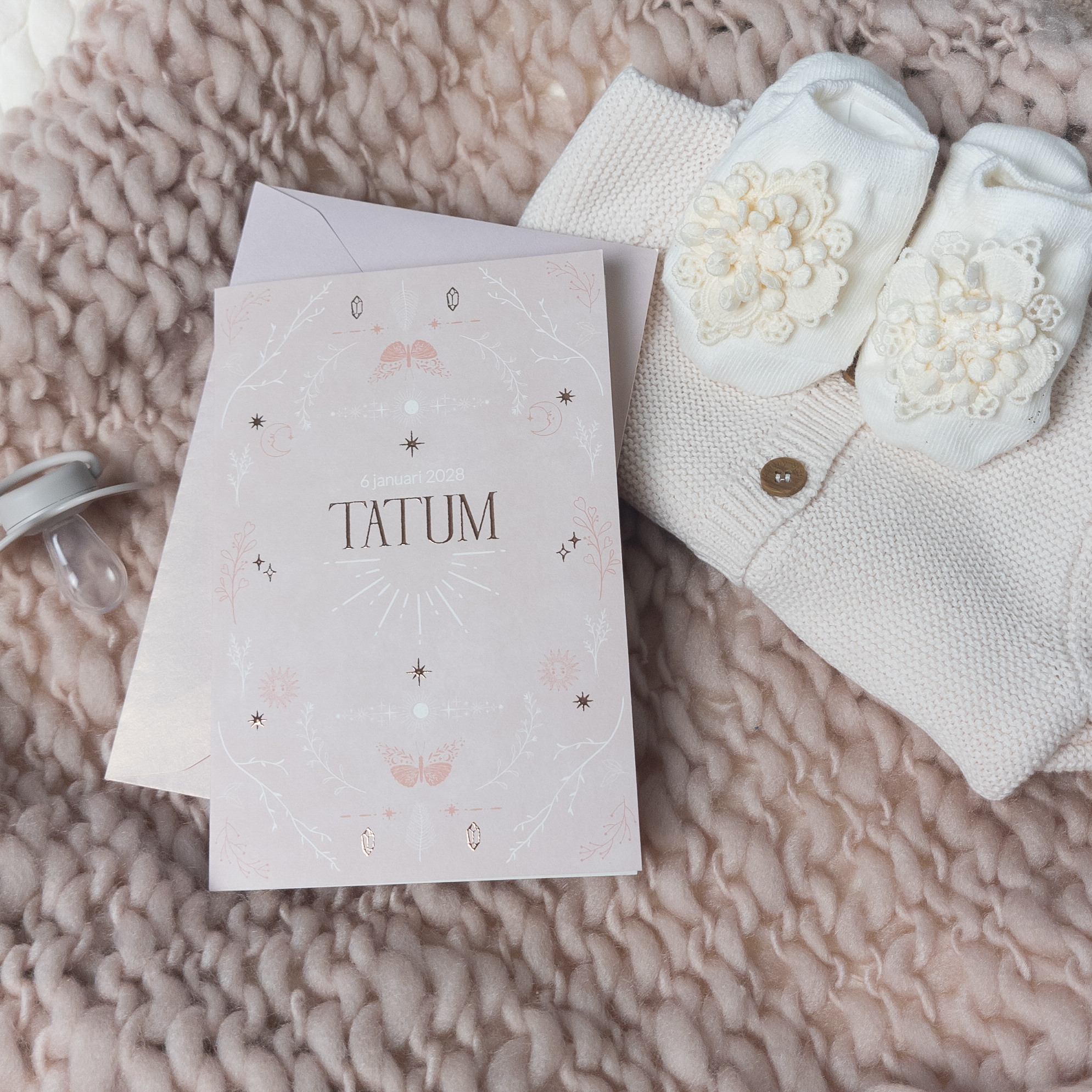 Geboortekaartje in astrologie/celestial thema in blush met roséfolie. Alle afbeeldingen zijn los geplaatst en kun je dus los van elkaar bewerken en een andere kleur geven.