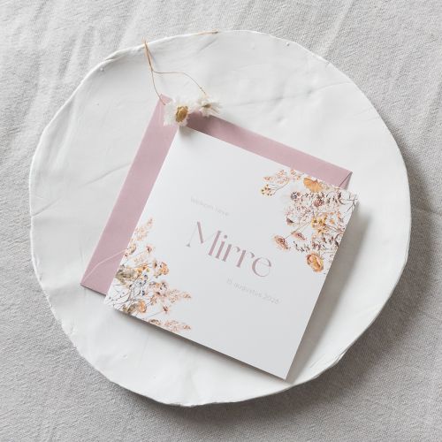 Neutraal geboortekaartje met rustige kleuren en mooie droogbloemen print. De bloemetjes op dit geboortekaartje komen ook aan de binnenkant en op de achterkant van het kaartje terug.