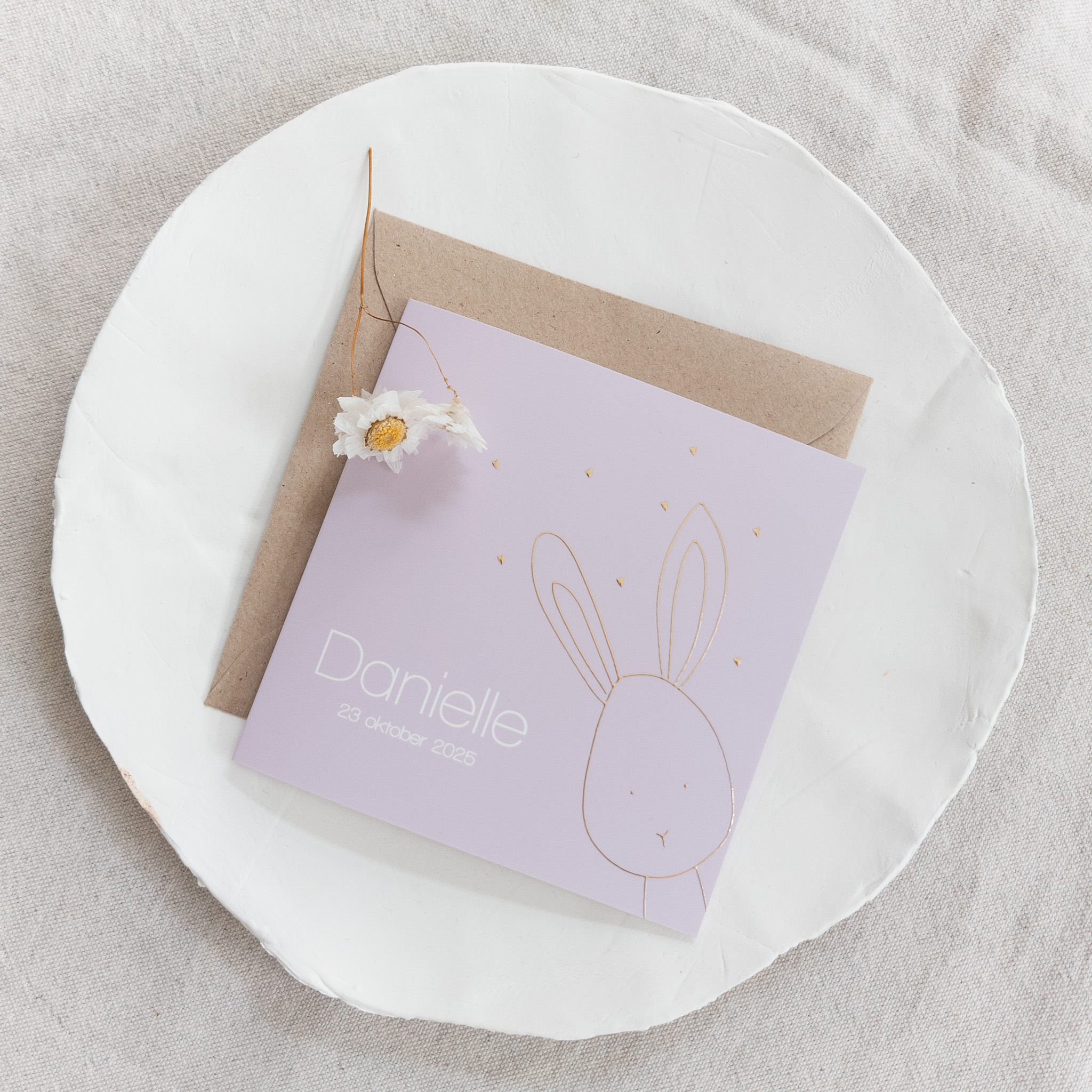 Geboortekaartje met konijntje in lila en wit met goudfolie