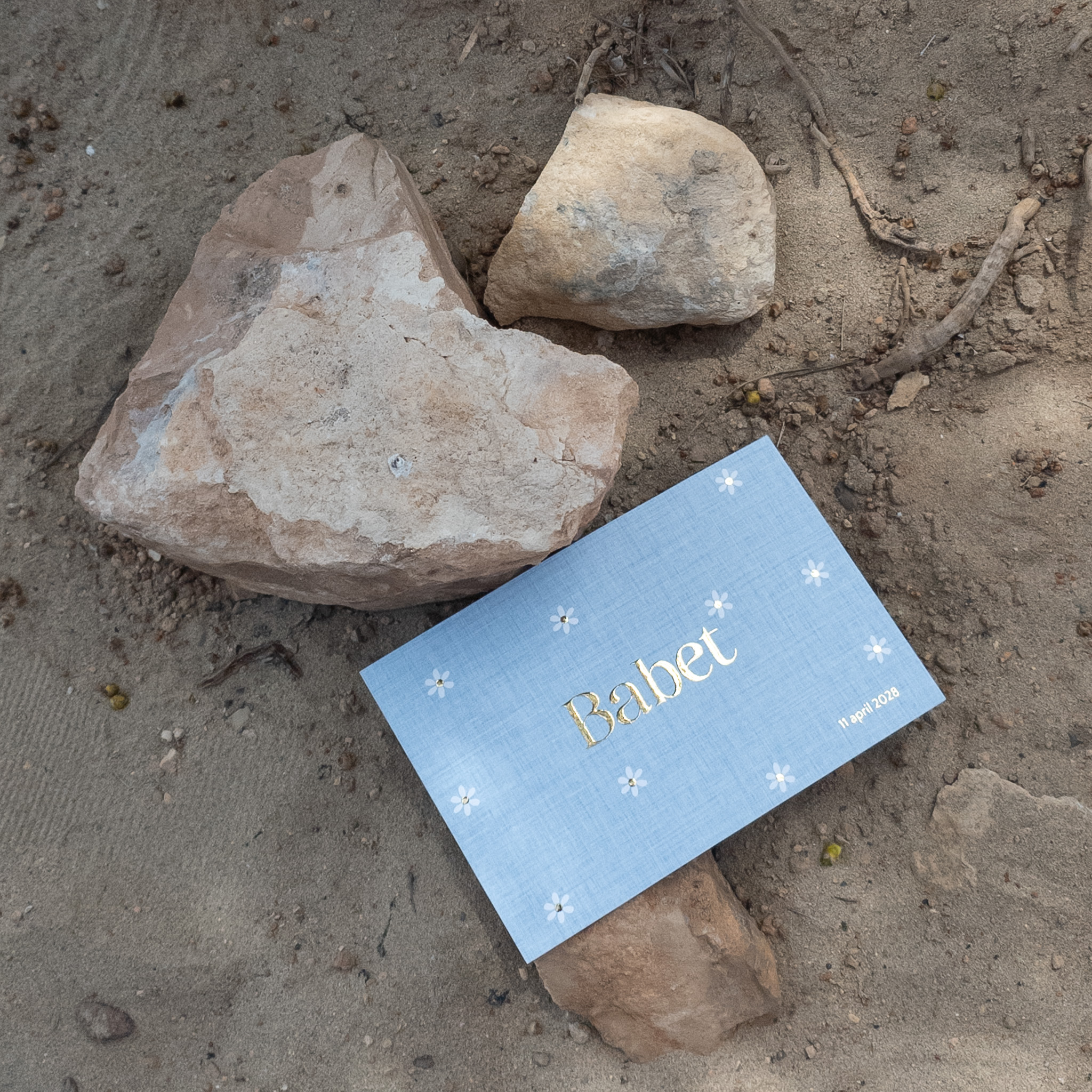 Schattig geboortekaartje voor een meisje met madeliefjes en goudfolie accenten. De achtergrond is met een zacht blauwe linnen print afgedrukt. Babet