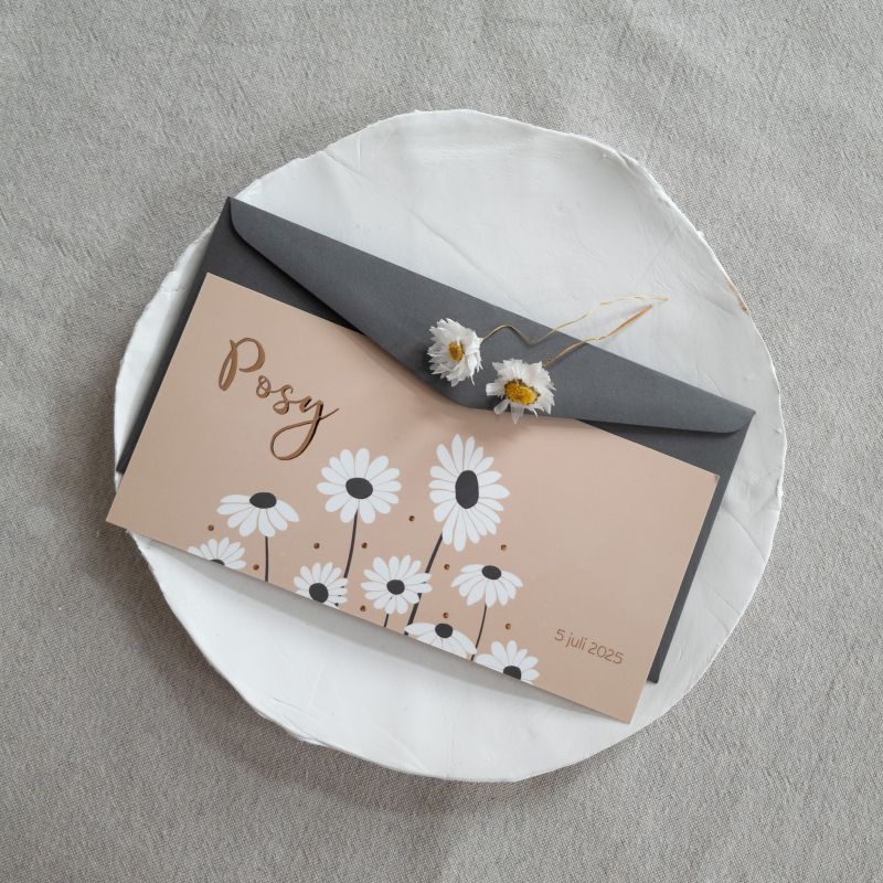 Wel bloemen op je geboortekaartje, maar dan wat stoerder? Kies dan voor dit lieve langwerpige kaartje met madeliefjes en roséfolie. Tussen de bloemetjes nog wat extra roséfolie stipjes. De foliekleur is aan te passen naar wens, misschien vind je goudfolie mooier? Het stoere meisjes geboortekaartje zit hem in de grijze details, waar je weer heel mooi een grijze envelop bij kunt kiezen! De afmeting is 10x21 cm en daar hoort een envelop in 11x22 cm bij!