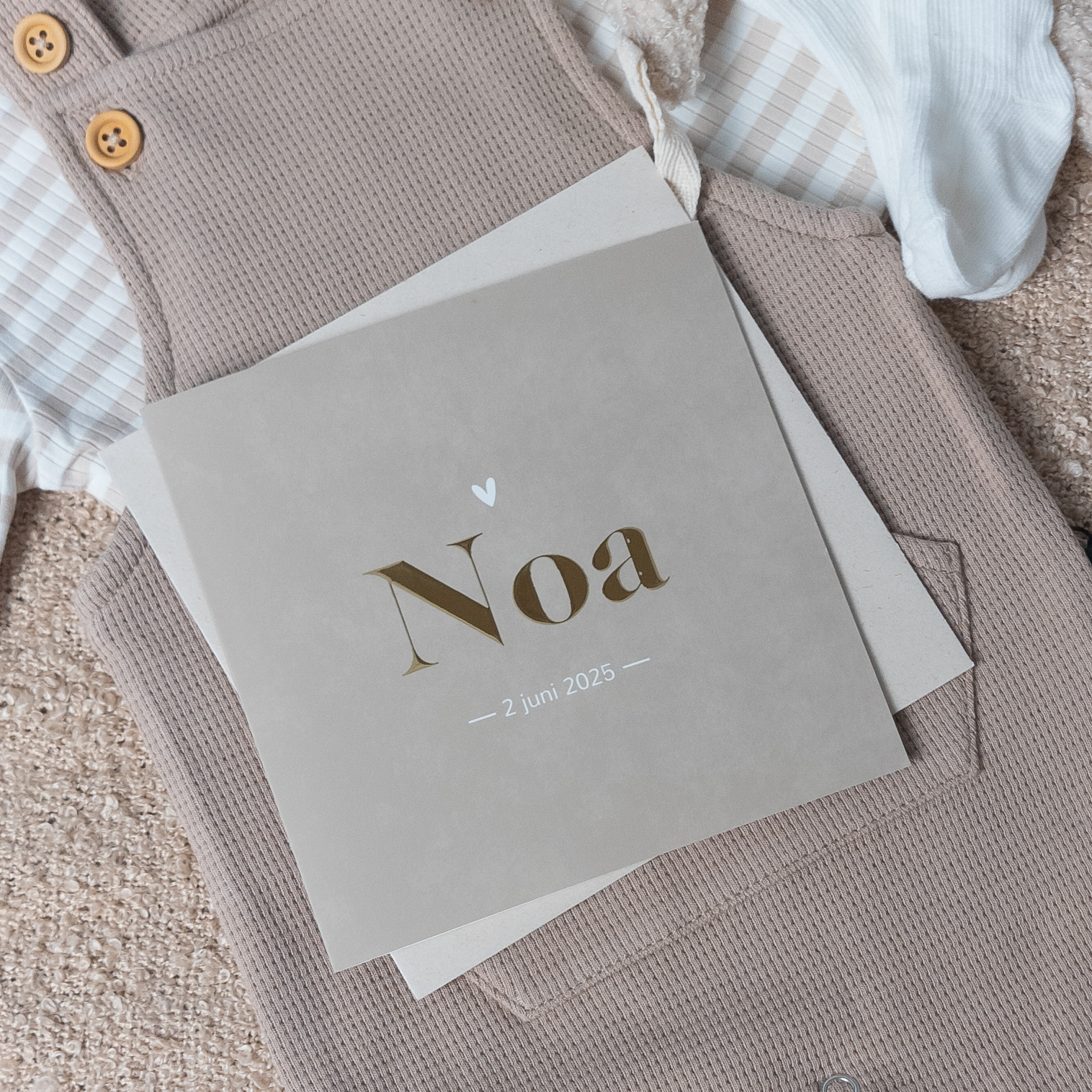 Lief minimalistisch geboortekaartje met een velvet look. Je kunt de foliekleur naar wens aanpassen! Op de foto zie je het velvet look geboortekaartje uitgevoerd in mat coated papier. De kleur neigt dan een beetje naar groenig beige. Wil je hem wat meer grijs beige, bestel hem dan op crescendo papier!