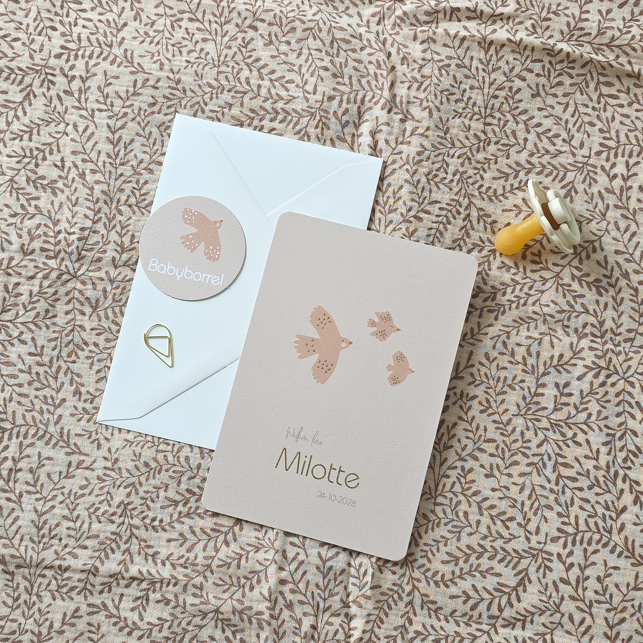 Het geboortekaartje heeft lieve, kleine details op de vleugels in goudfolie en ook de naam is in goudfolie gedrukt.