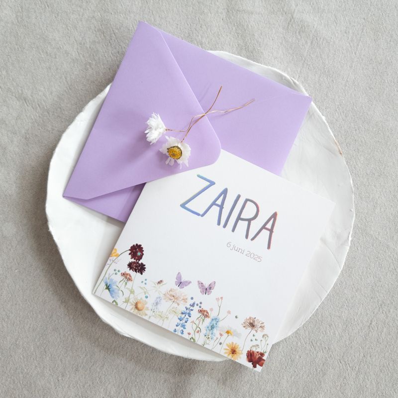 Bloem geboortekaartje met wilde bloemenprint, die doorloopt op de achterkant. Wil je een ander formaat? Laat het weten en het kaartje wordt kosteloos voor je omgezet in je account. Natuurlijk kun je er ook voor kiezen om dit geboortekaartje met goudfolie te laten drukken, of een andere folile kleur.