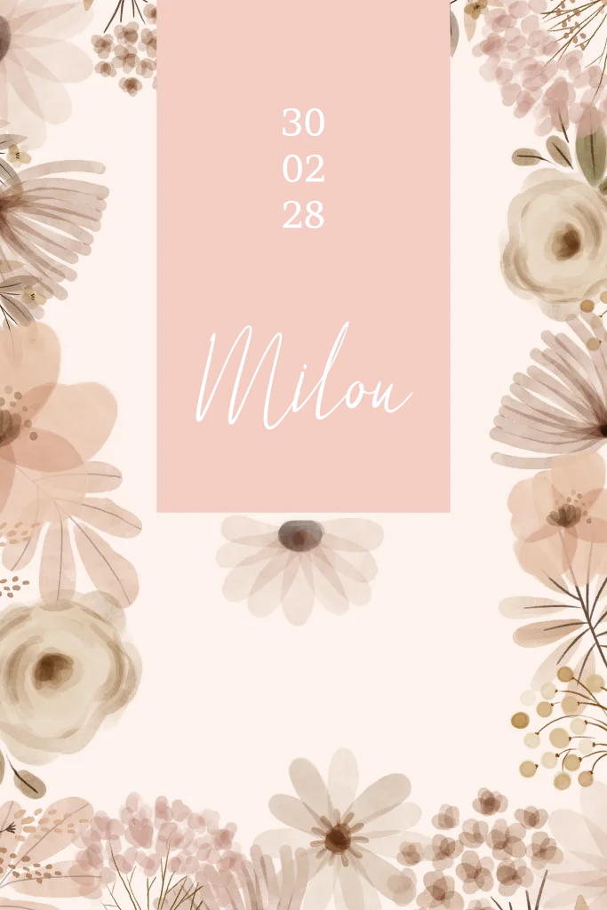 Floral meisjes geboortekaartje met een bloemen rand rondom en een roze label met in foliedruk de naam en datum. Mooi op mat coated karton. Voor een wat softere look kies je voor linnen papier!