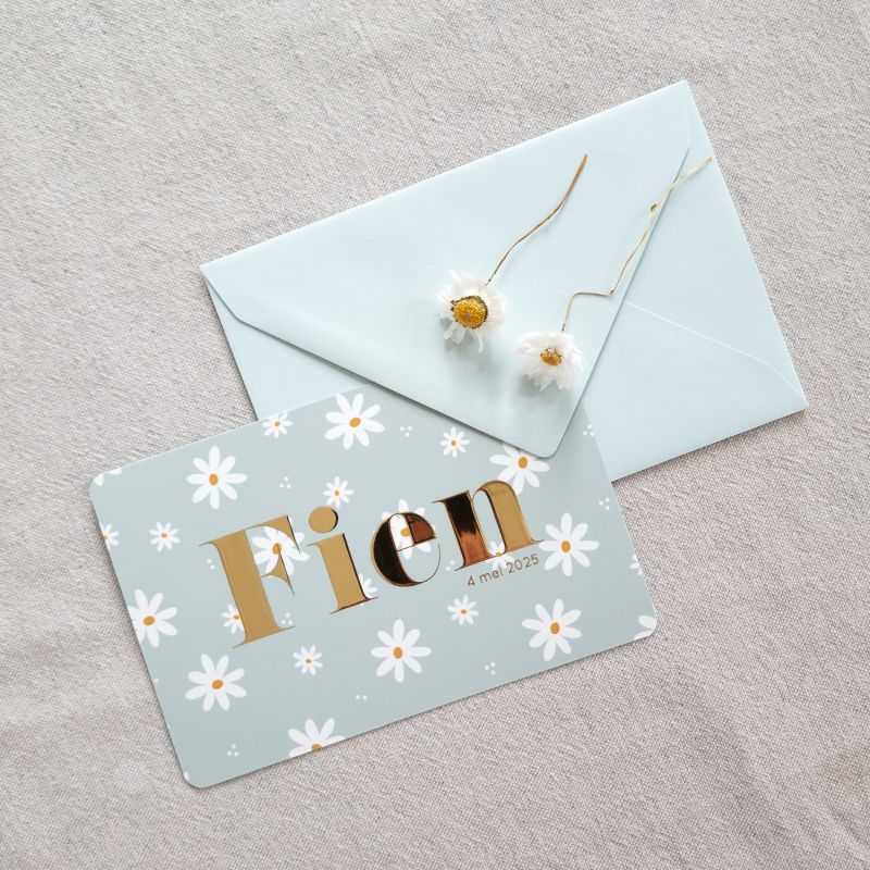 Lief geboortekaartje met all over print in madeliefjes. Ohhh zo schattig!! De madeliefjes print staat in meerdere kleuren in de beeldbank. Denk aan beige, roze, blauw of groen. De naam in grote letters in goudfolie knalt er uit!! Natuurlijk kun je ook hier kiezen voor rosefolie of een andere kleur folie naar wens.