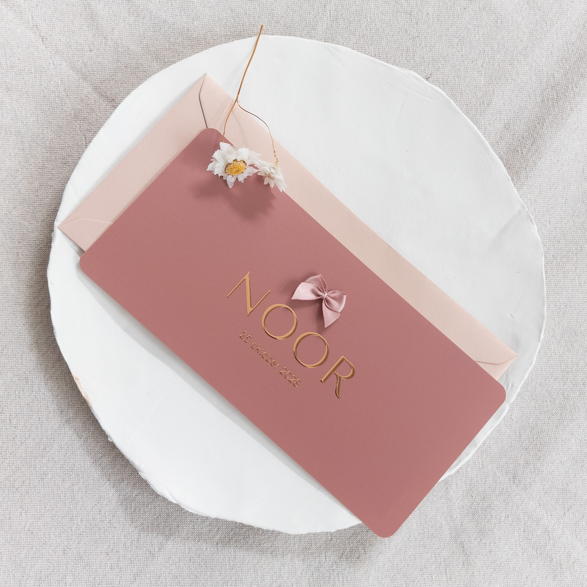 Geboortekaartje met strikje, afgeronde hoeken en roséfolie