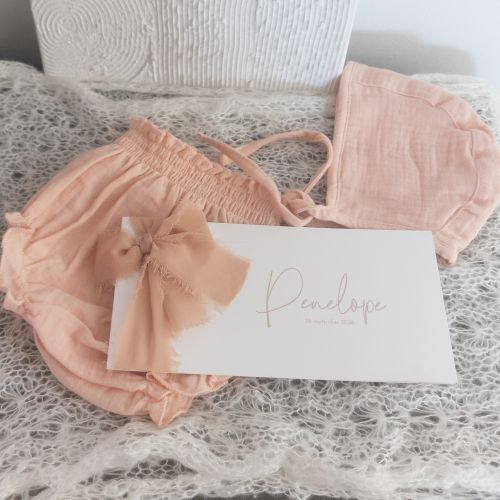 Klassiek en tijdloos geboortekaartje wat is afgedrukt op linnen papier wat een lichte structuur heeft en net van het wit af is. De teksten werden in een beige kleur gedrukt, wat overeenkomt met het beige lint wat om de kaart heen wordt gestrikt.