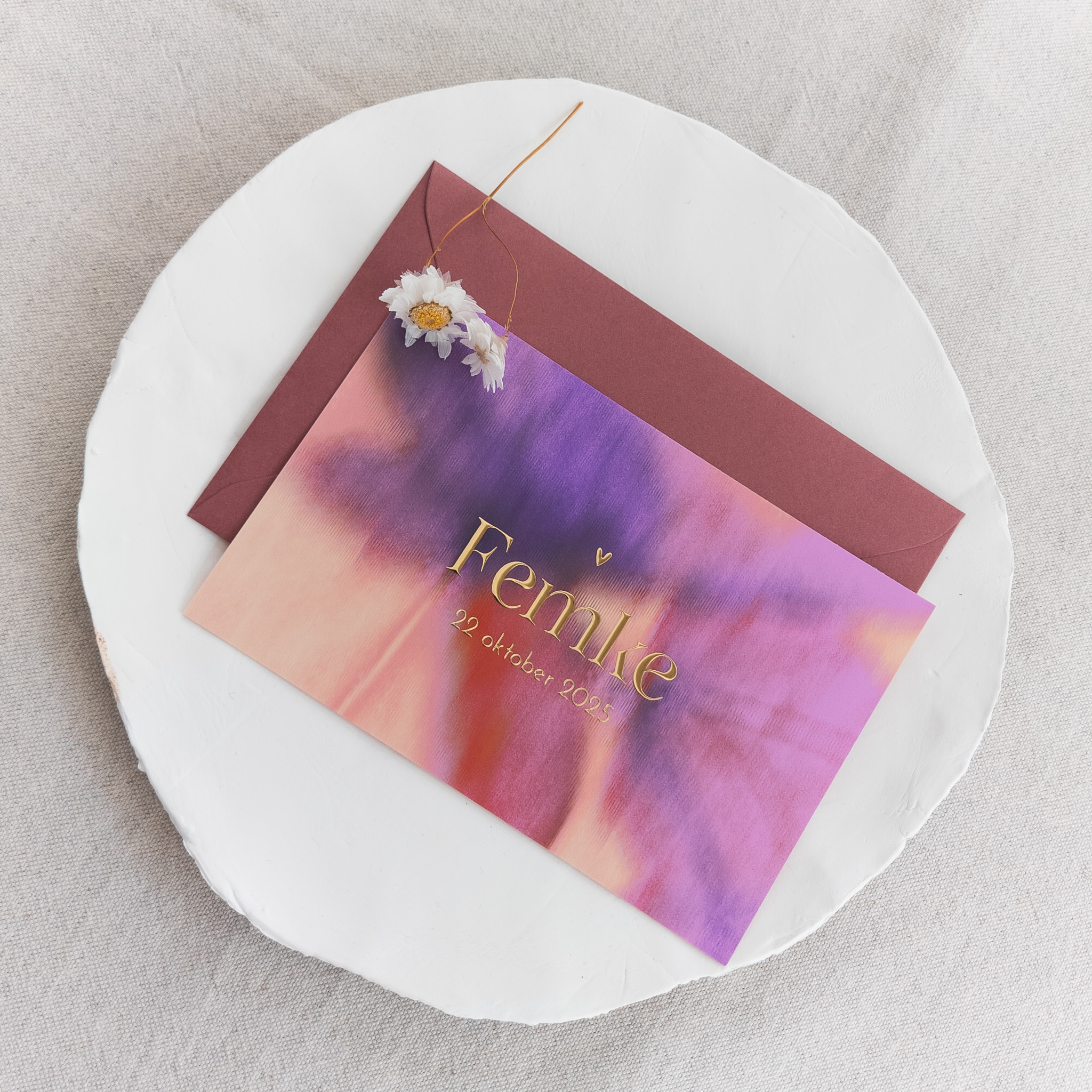 Kleurrijk geboortekaarte in ribfluweel tye dye print met goudfolie