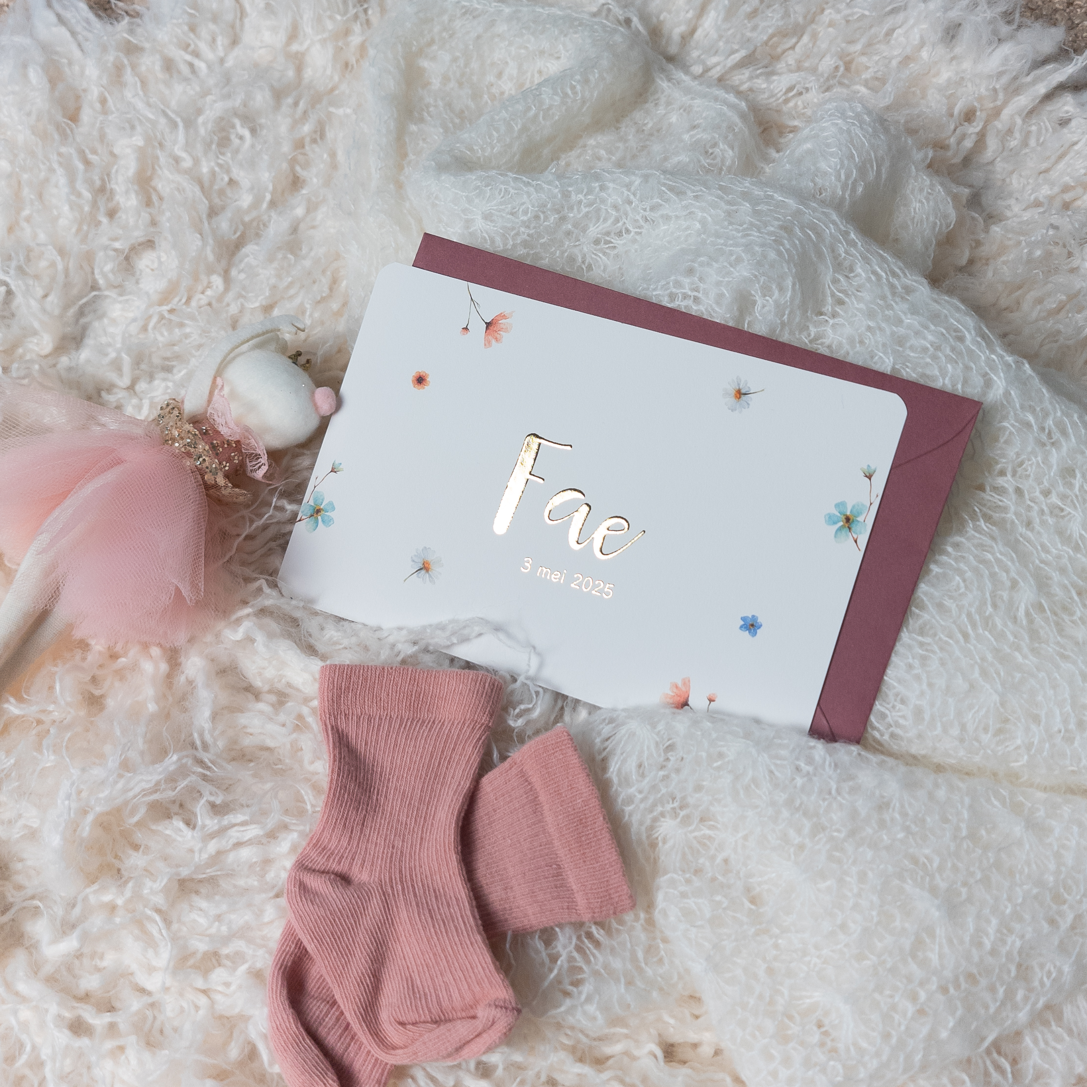 Kleurrijk geboortekaartje met bloemetjes en goudfolie