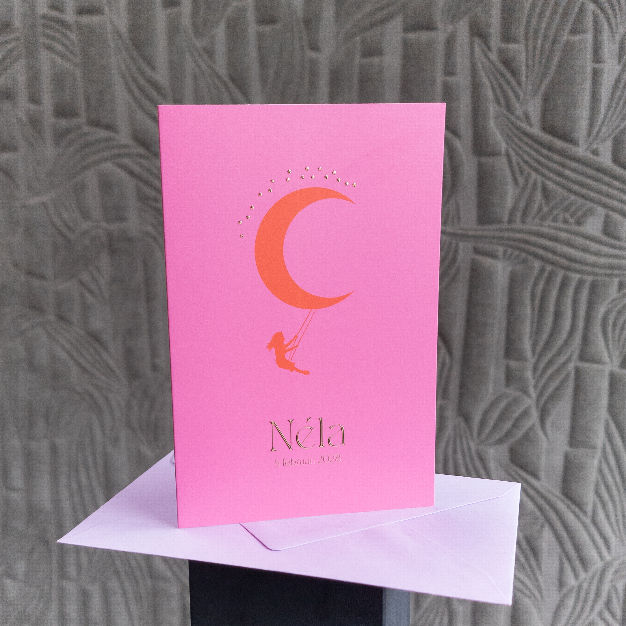Geboortekaartje met silhouet van een maan met een schommelend meisje. De achtergrond heeft een fel roze kleur en de maan is in oranje weergegeven. Deze kleuren komen het best tot hun recht op mat coated karton. Vind je de kleuren te fel, dan kun je deze natuurlijk aanpassen naar wens. De naam, datum en sterretjes zijn in goudfolie gedrukt. Pas achtergronden, afbeeldingen en lettertypes aan met de leukste items uit de beeldbank!