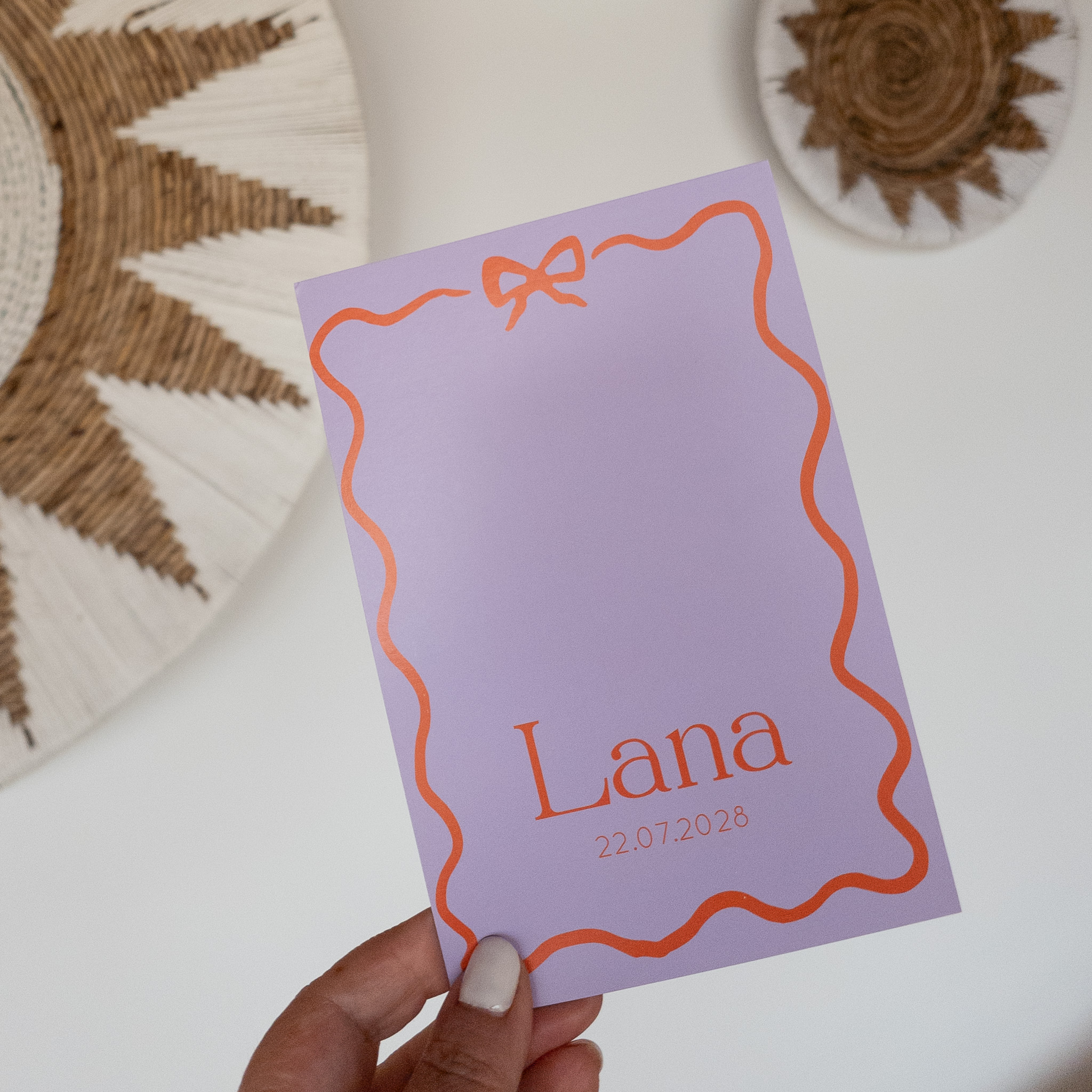Heerlijk kleurrijk geboortekaartje voor jullie dochter in lila met oranje details. Lana