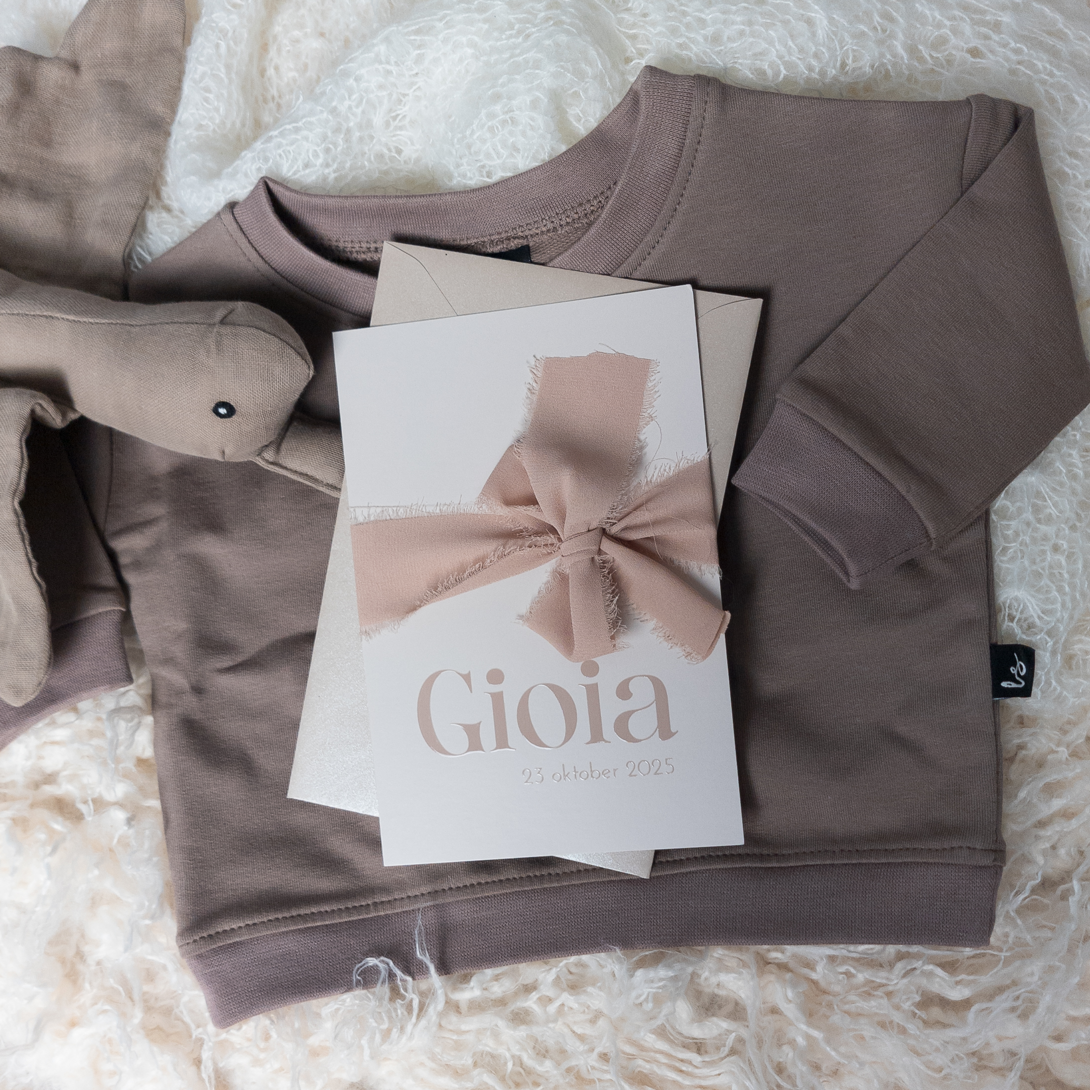 Naturel geboortekaartje blush met UV spotlak en zijde lint