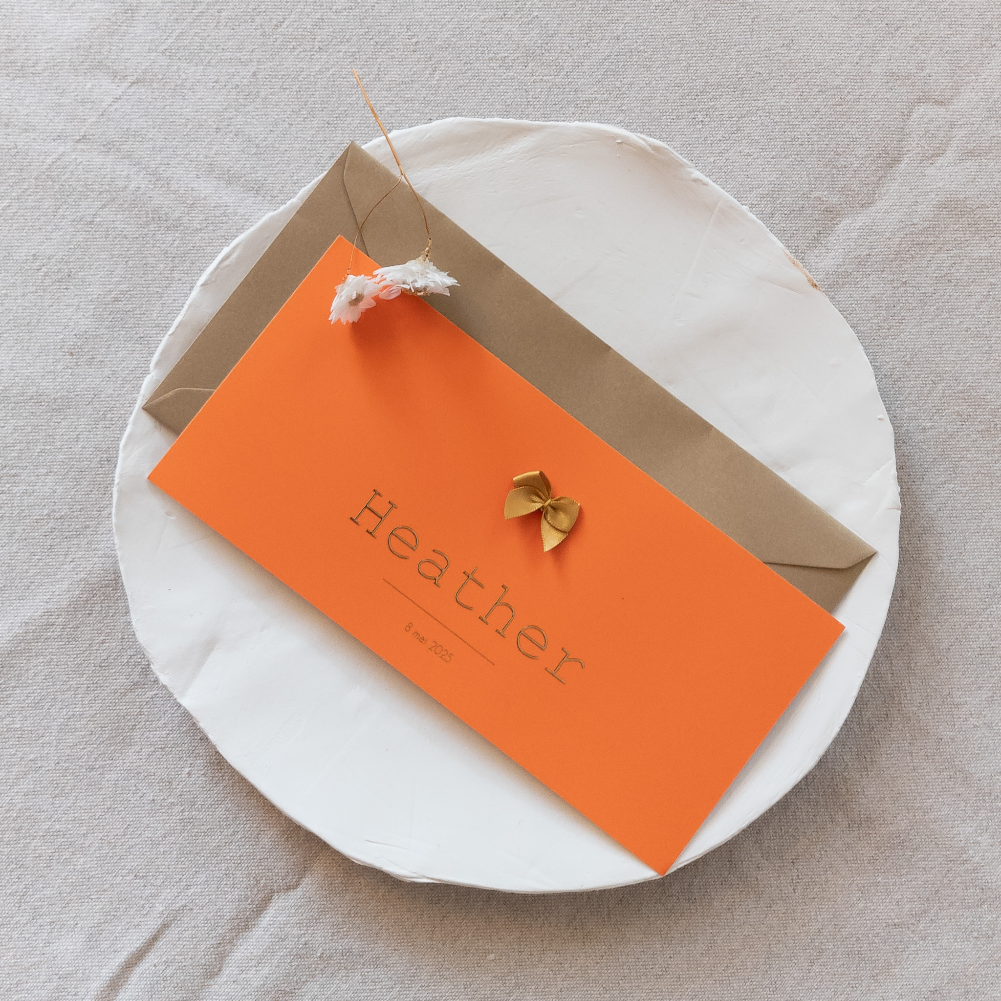 Oranje kleurrijk geboortekaartje met goudfolie en echt strikje