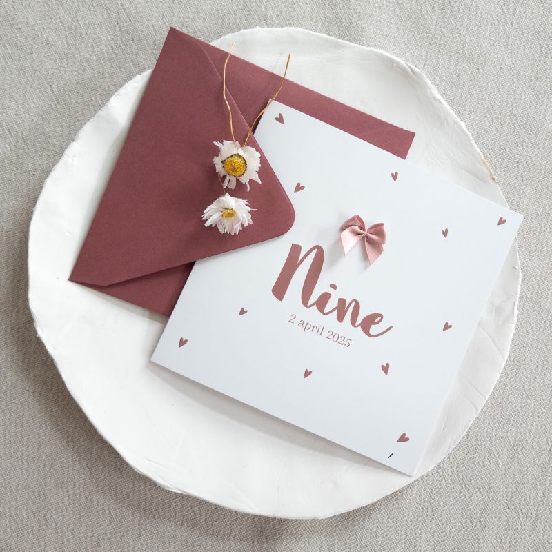 Lief op linnen papier! Je kunt de hartjes en de naam ook een andere kleur geven. Gebruik van spotlak of foliedruk is ook naar wens te kiezen!