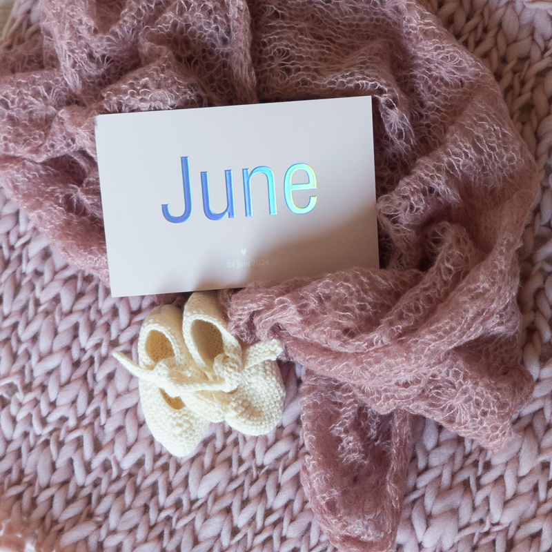 pastel roze geboortekaartje met holografisch folie