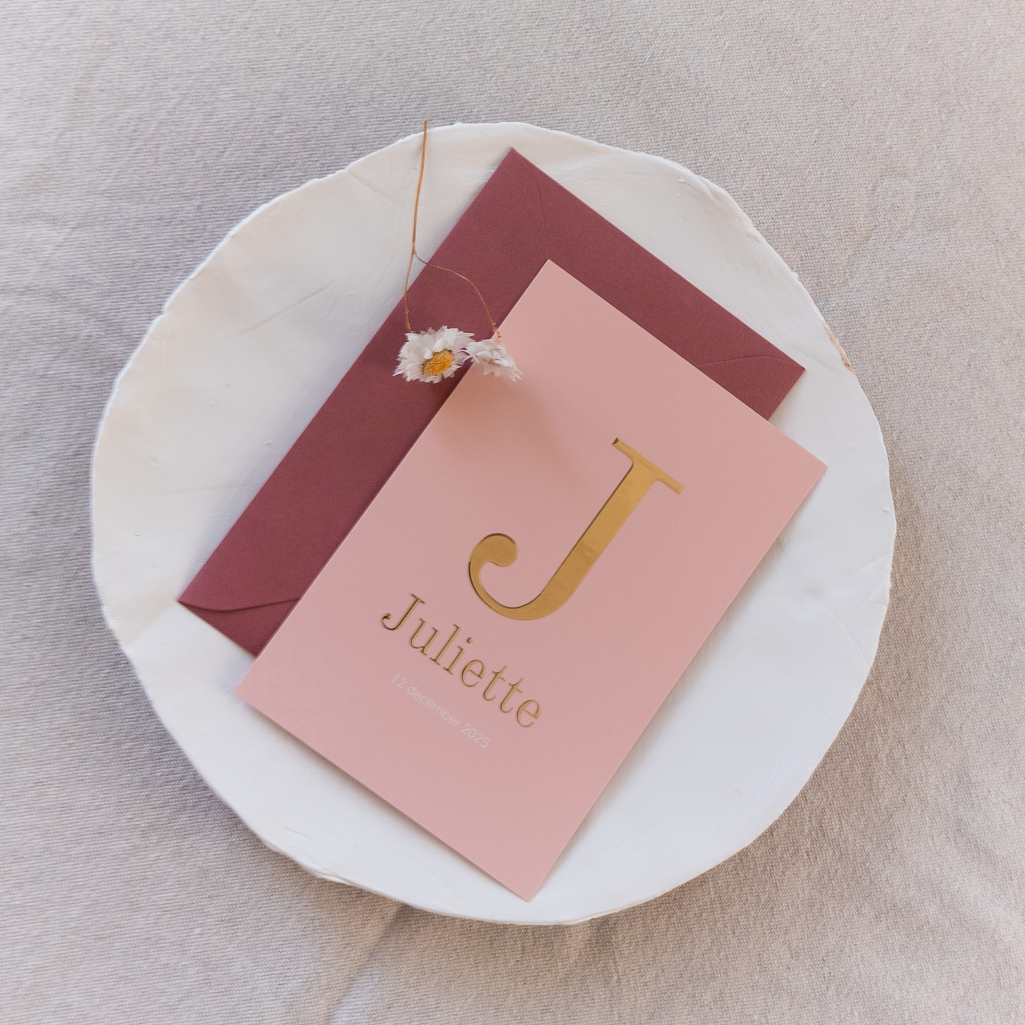 schattig simpel meisjes kaartje in lief tintje roze met grote goudfolie initiaal. Pas de achtergrond kleur, het lettertype of de foliekleur zelf aan!