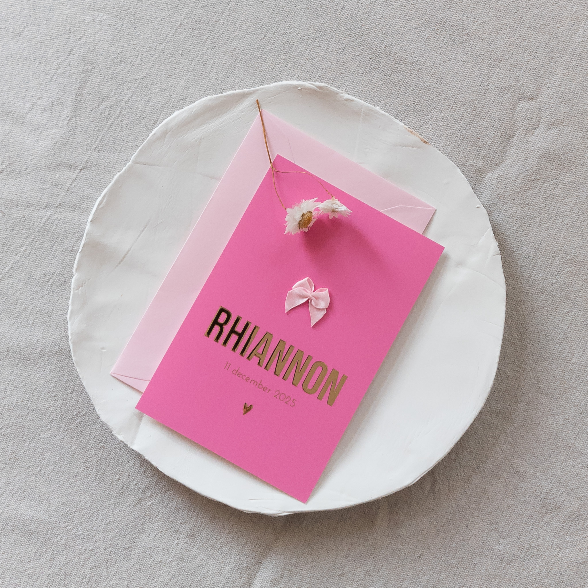 Zuurstok roze geboortekaartje met strikje en goudfolie