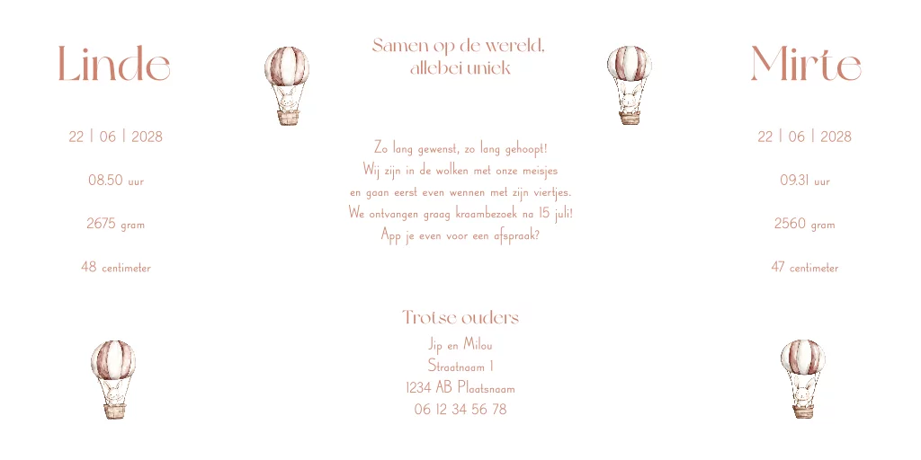 Geboortekaartje voor tweeling meisjes met een theatervouw! De voorkant bestaat uit 2 deurtjes die naar elkaar toe dicht vouwen.