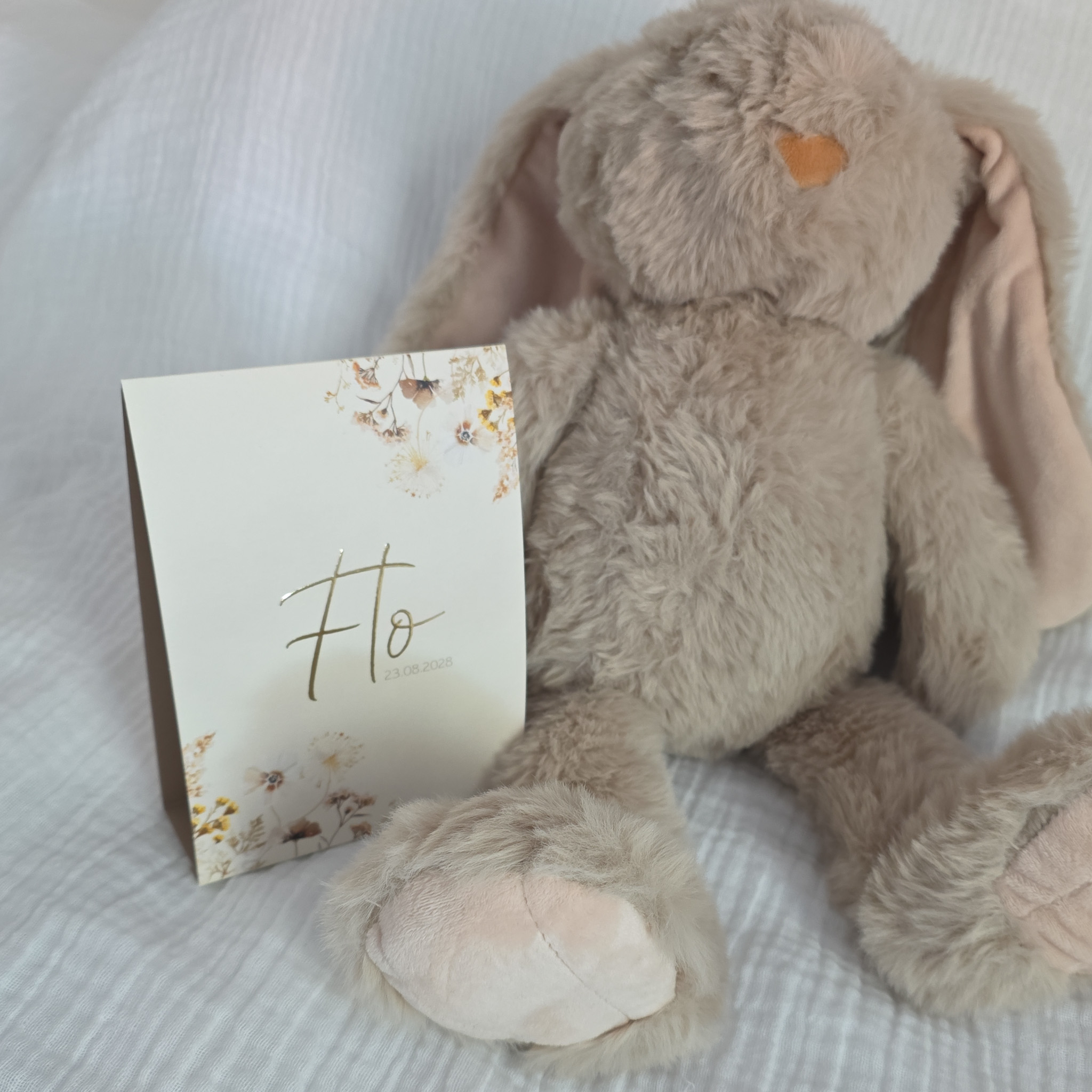 Lief tentvorm geboortekaartje met een zacht créme velvetlook print met watercolor afbeeldingen van droogbloemen.