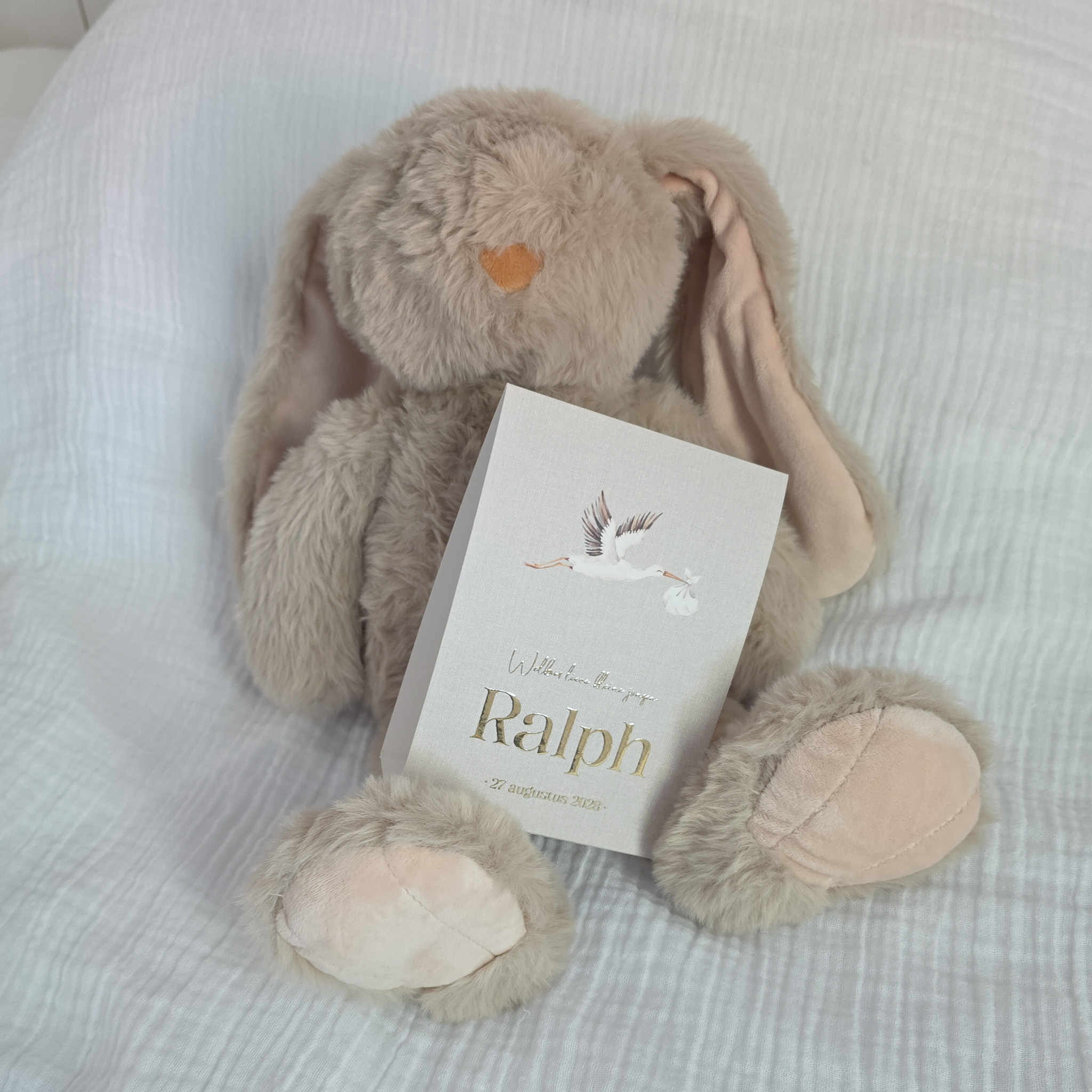 Stoer geboortekaartje in tentvorm. De frisse grijs beige linnen print op papier geeft een heel stoer effect aan dit kaartje met ooievaar! Details in goudfolie die ook op de achterkant zijn toegevoegd. De binnenzijde kreeg een crème kleur voor een mooi diepte effect.